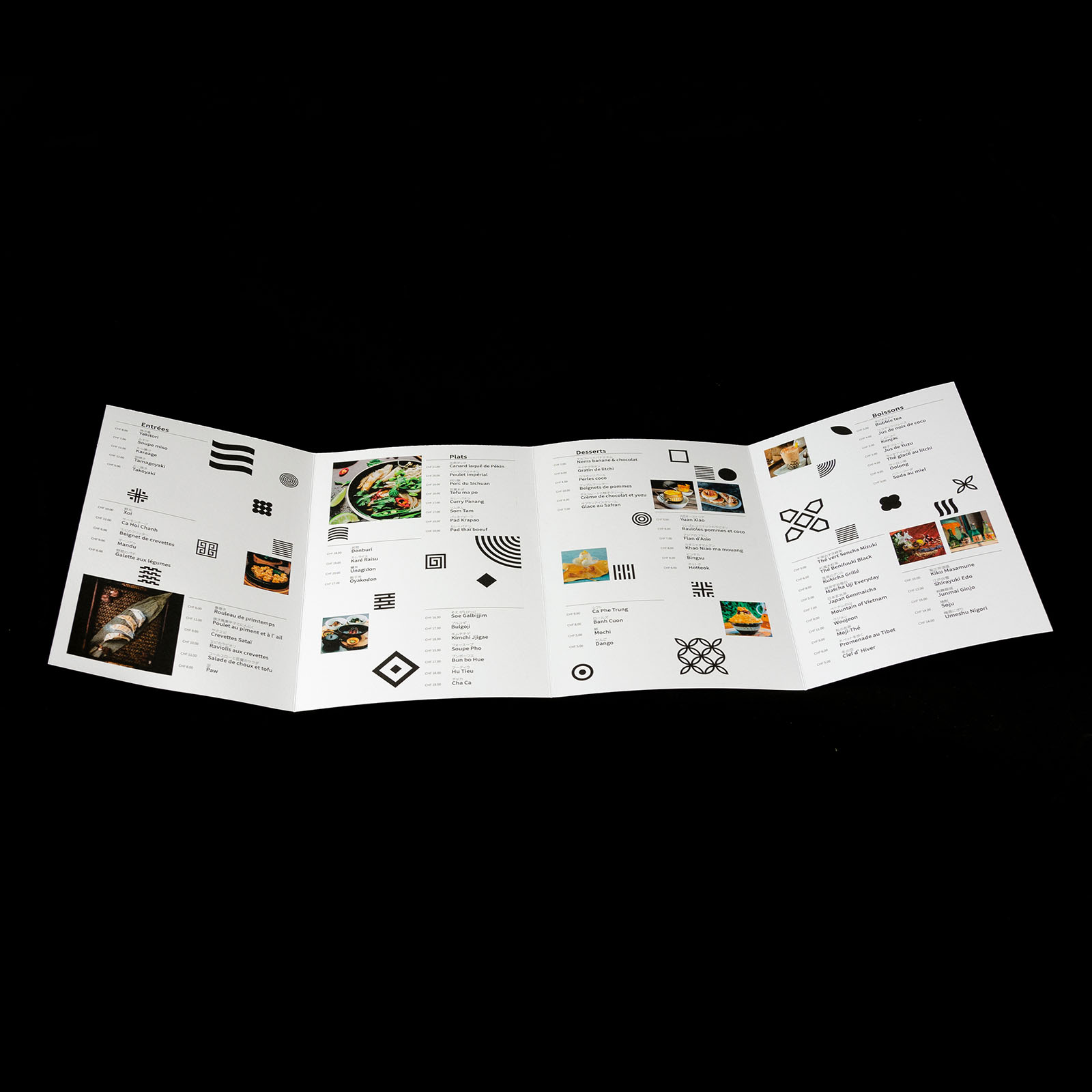 Shiso est un restaurant asiatique fictif basé à Lausanne. Il propose diverses recettes provenant de différents pays d’Asie. L’établissement permet un voyage dans plusieurs cultures en un seul repas grâce à un choix de goûts variés. Shiso met également à disposition un service take-away simple grâce à ses boîtes qui peuvent s’adapter aux plats. L’identité visuelle se base sur les différents motifs décoratifs que nous pouvons retrouver dans les pays d’Asie. Elle les adapte, les simplifie et les assemble côte à côte en jouant avec leur taille.