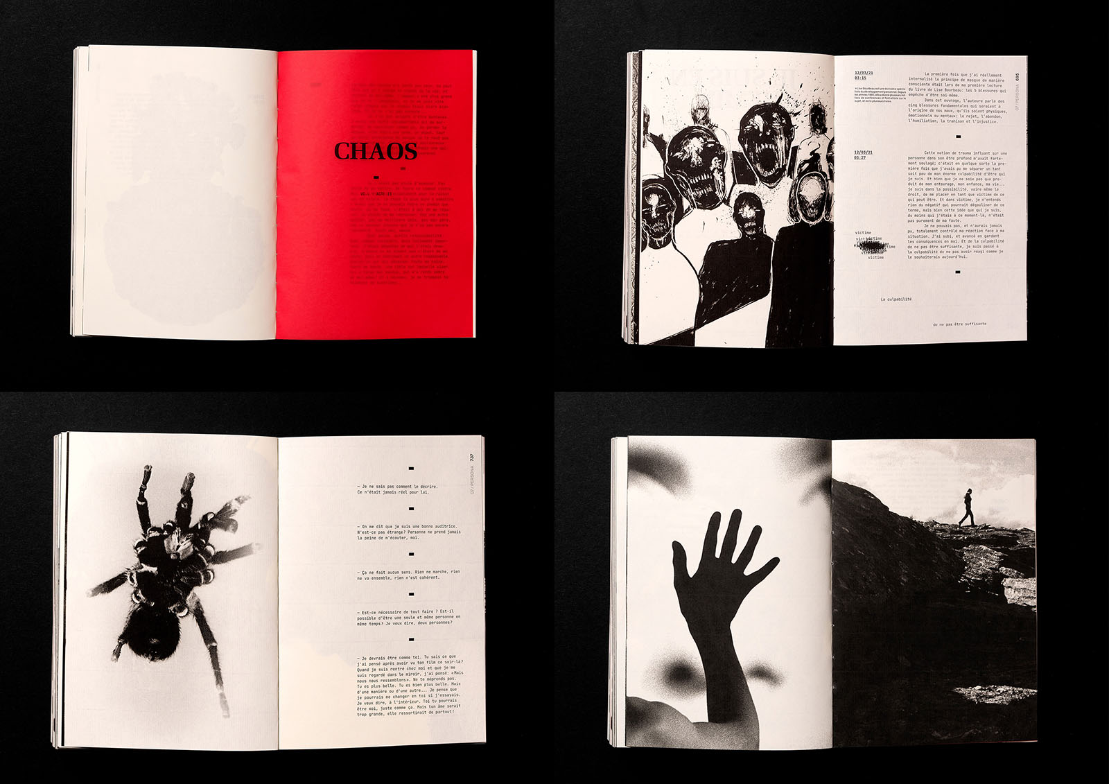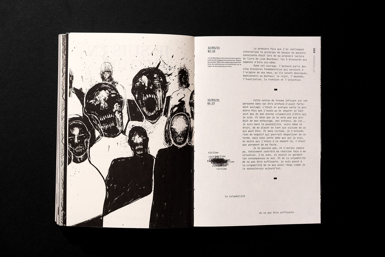 Ce projet de diplôme explore ma volonté de non seulement me détacher, mais surtout de faire face à mon masque: la persona; masque social introduit par Carl Jung. Ce livre-réflexion est une représentation de mon cheminement personnel face à la thématique du masque en tant qu’objet et métaphore. Il a pour but de retracer le chemin tumultueux de la pensée dans sa nature propre: chaotique, emplie de doutes et de questions, et souvent sans réponses. J’ai ainsi mis en page, imprimé, relié et rédigé tout le contenu du livre, enrichi par des études, des musiques, etc. Je l’ai illustré d’expérimentations visuelles analogues de mes photographies personnelles et d’autres artistes pertinents.