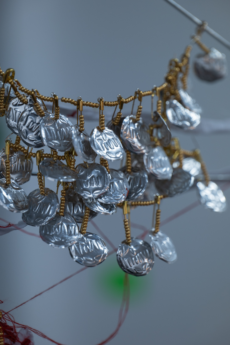 Il s’agit d’une recherche identitaire à travers la fabrication et la transformation. Je recrée un tapis, une tenue et un collier. La réalisation manuelle de ces éléments est lente, mais leur métamorphose est presque instantanée. La robe s'allège de "ce qui n'était plus si précieux". Le tapis se recouvre d’empreintes résultant d’un geste simple mais indélébile, comme un échange ou une discussion.