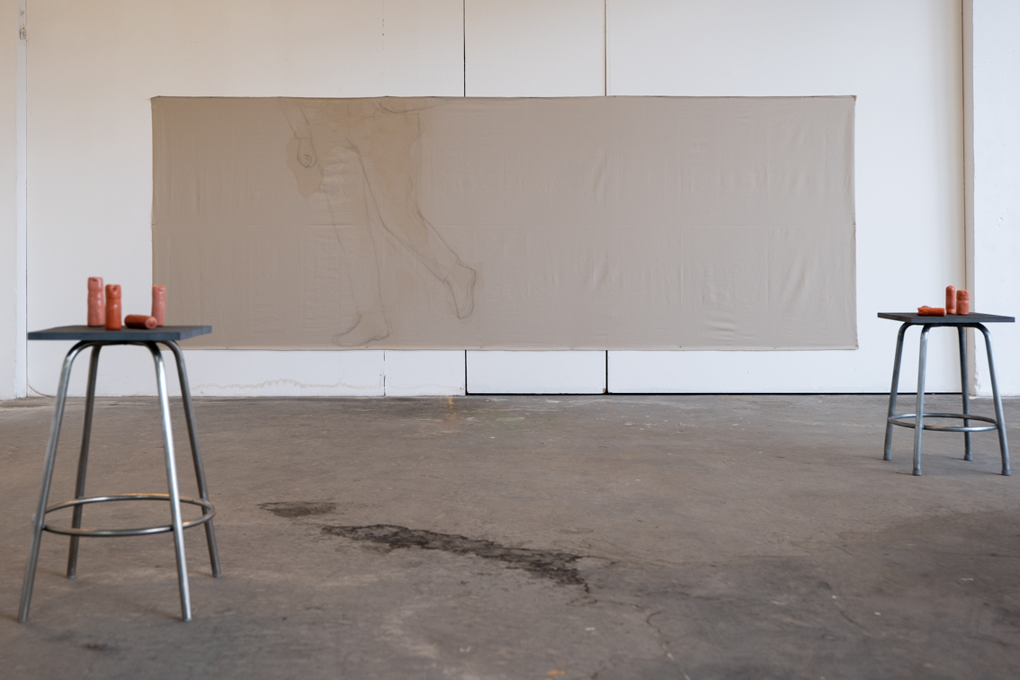 Crayon et spray au poivre sur tissu (145 × 400 cm), céramiques et silicone, bois et métal (env. 10 cm, env.