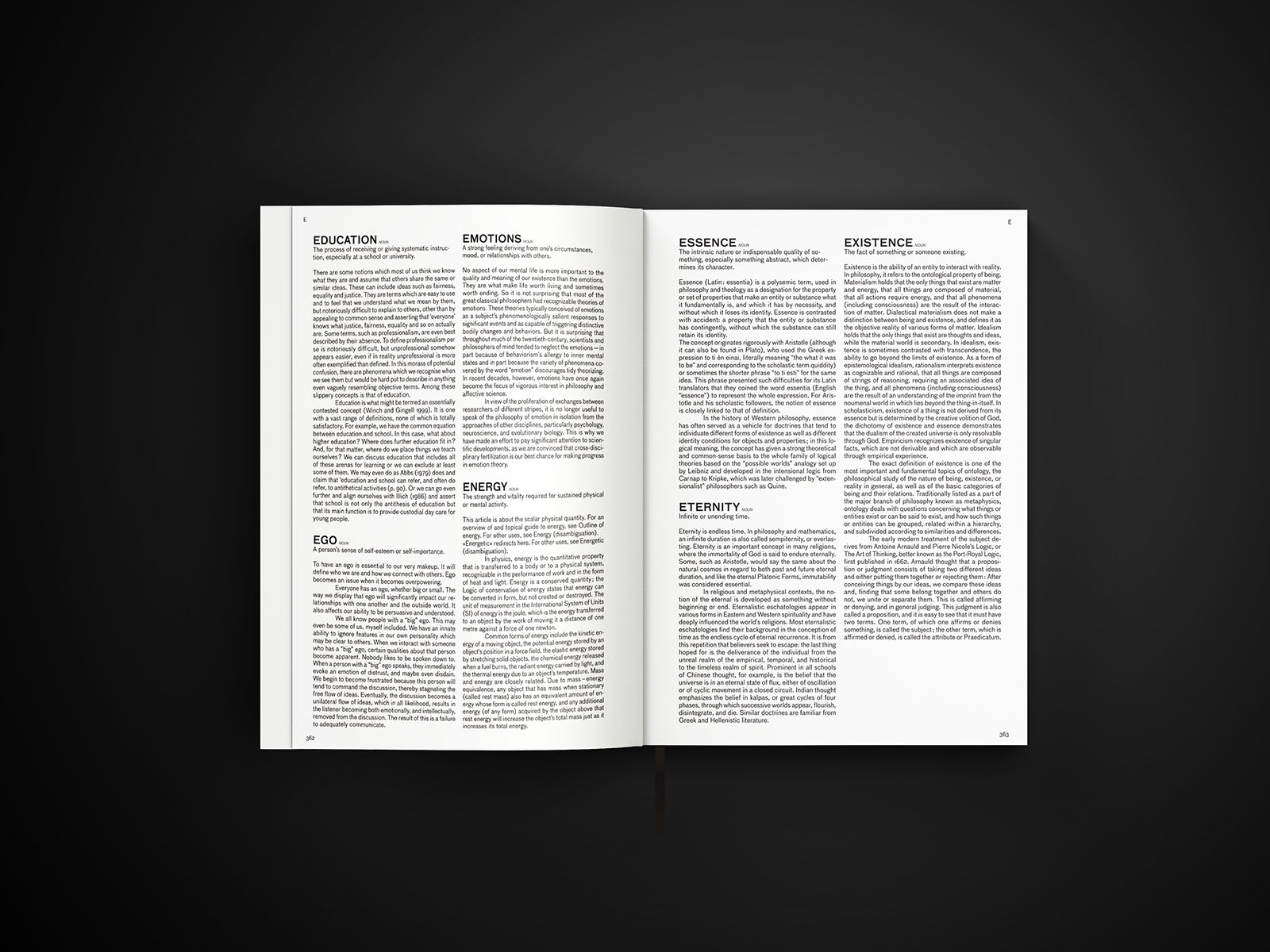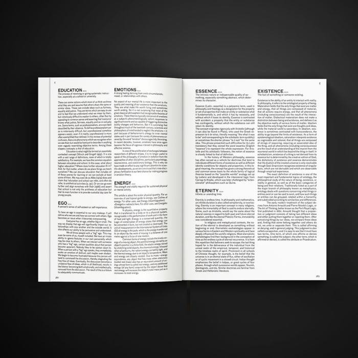 Ce lexique de l’abstraction a recours à des intelligences artificielles de manière à représenter ces concepts humains. L’esthétique du livre révèle une certaine discipline dans sa typographie et son gabarit, contrastant avec l’aspect chaotique de certaines images. Le lexique illustre l’interprétation visuelle des concepts humains par la technologie.