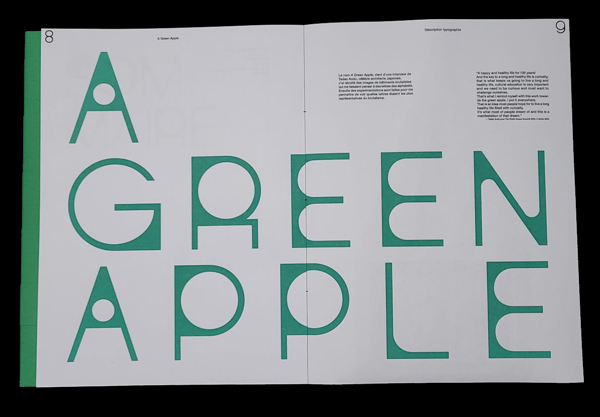 J’ai travaillé sur la création d’un livre et d’un spécimen autour d’une typographie sur les alphabets latin et cyrillique basée sur le brutalisme. J’ai pour cela récolté des images d’architecture de ce style qui font penser aux lettres des deux alphabets et soulignent les étapes de la création de la typographie. L’ouvrage comporte des définitions de chaque style architectural qui a précédé le brutalisme et de ceux qui en sont dérivés, ainsi qu’une explication de l’importance et de l’identité de la typographie.
