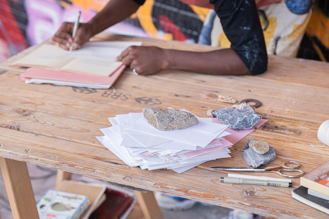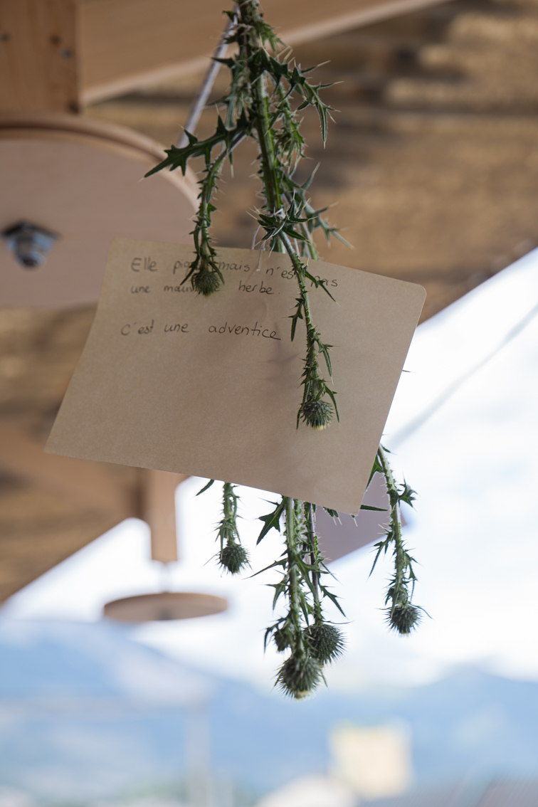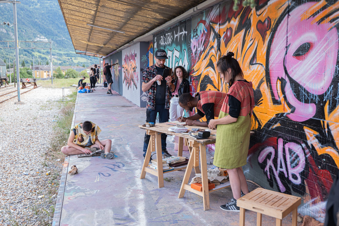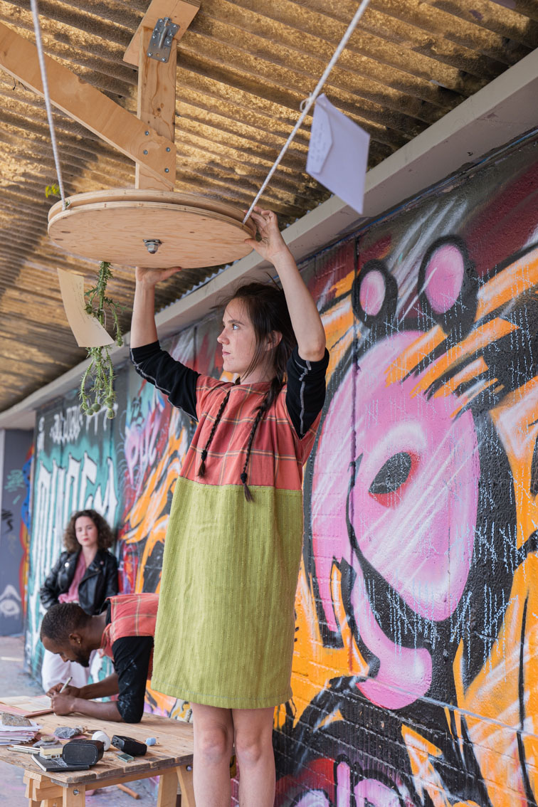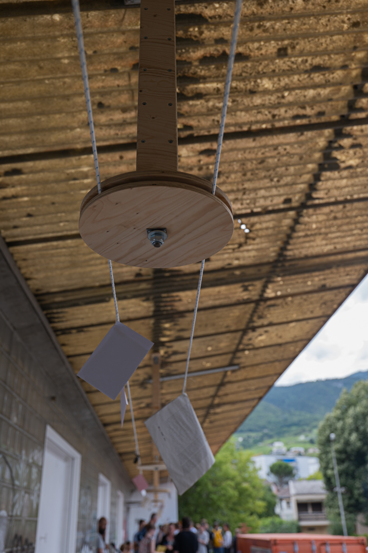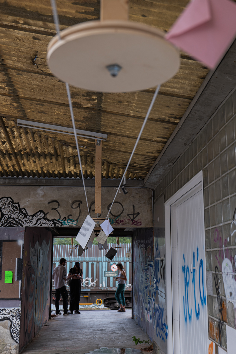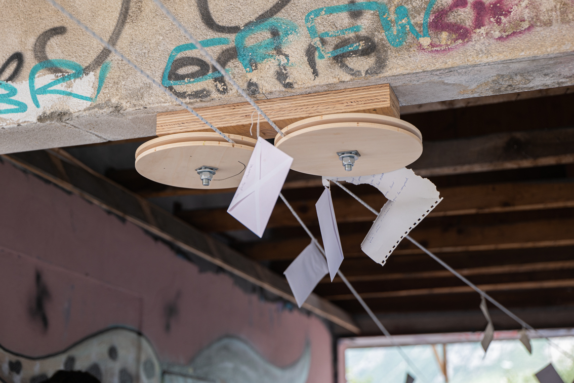 Des poulies, du papier, des comédiennes, des topinambours, des trains, des tags. Une corde, à laquelle sont suspendus les lettres et colis qui transitent entre l’entrée de l’exposition et le chemin de fer, tourne autour des poulies. Au bout de cette installation, le mécanisme est activé par des personnages qui semblent habiter le lieu. Ils font tourner la grande poulie, accrochent le courrier, transcrivent ce qu’ils observent. Ils mangent aussi… cuisinant quand les employés CFF sont en pause, arrosant parfois les topinambours plantés sur le bout de terre situé de l’autre côté des rails.