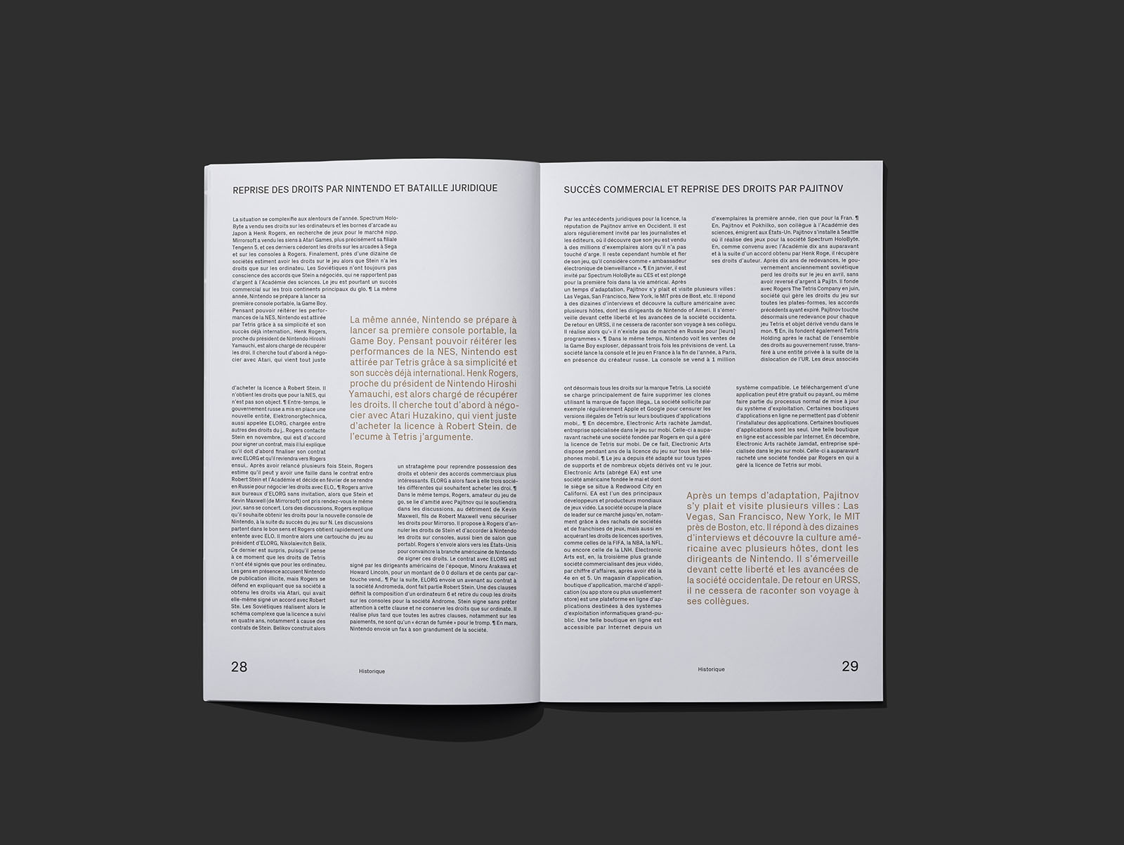 Tétris est une réinterprétation print du célèbre jeu vidéo. Le journal présente le système du jeu, son histoire, son accueil, ses versions, sa postérité, et ses compétitions. J’ai réimaginé son design afin de retranscrire au mieux son caractère électronique en un journal. C’est pourquoi celui-ci n’est pas relié: on peut agencer librement les pages comme des tétriminos. Il y a notamment des effets de juxtaposition et la suite logique d’une page ne se trouve pas forcément là où on s’attend à la voir.