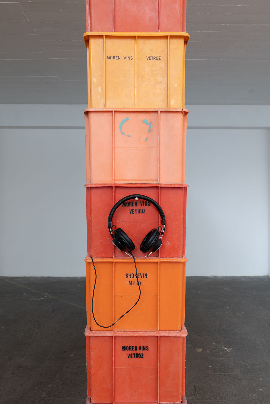 2021, installation, caisses à vendange assemblées (240 x 200 x 33 cm) et bandes sonores (durées variables, en boucle)