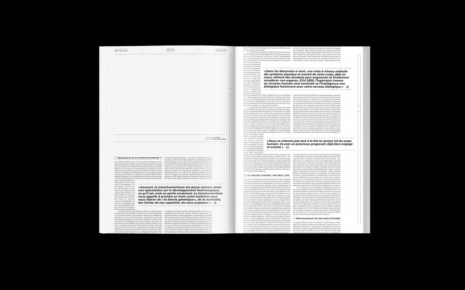 Avant de vous évader pour Mars, lisez le magazine fictif Mirage. Entre rêves, virtualité et réalité, Mirage s’intéresse à la conquête spatiale, à la mode de demain, aux réseaux sociaux, au progrès technologique et au mouvement du transhumanisme. Ce magazine vous transportera dans son univers onirique et futuriste avec des images 3D, des photographies personnelles ainsi qu’une mise en page inspirée du web. Mirage vous ouvrira les yeux sur l’illusion que l’avenir vous tend, tout en espérant vous offrir un moment d’évasion.