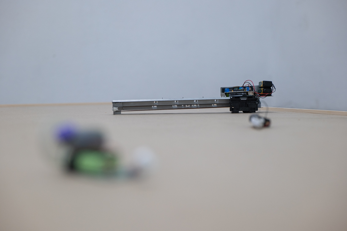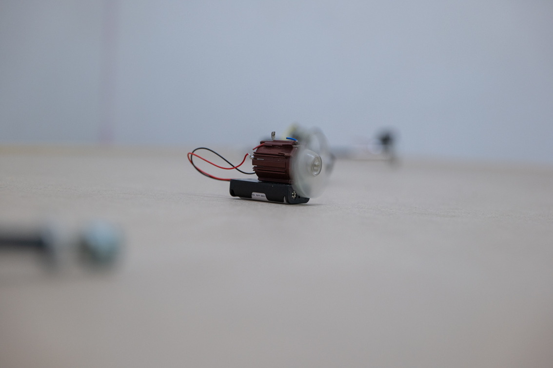 Au coeur d’appareils électroniques variés, destinés à différentes fonctions, se trouve le mouvement. Une fois leurs petits moteurs dénudés de presque tout ce qui les entourait, ils sont libérés de leurs tâches et ont comme seule occupation de se mouvoir. Autonomisés, ils vont et viennent au rythme de leurs caractéristiques, qui semblent devenir une personnalité. Leur joyeux tintamarre est amplifié par le caisson en bois sur lequel ils se déplacent.
