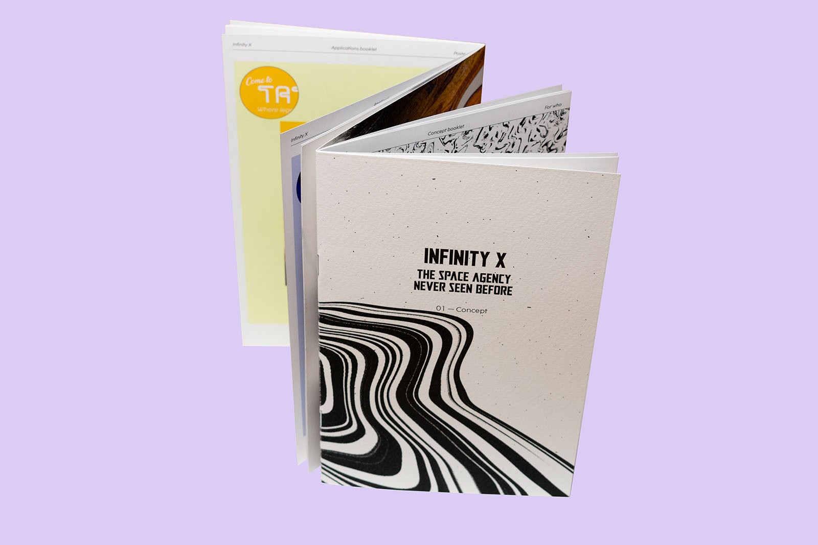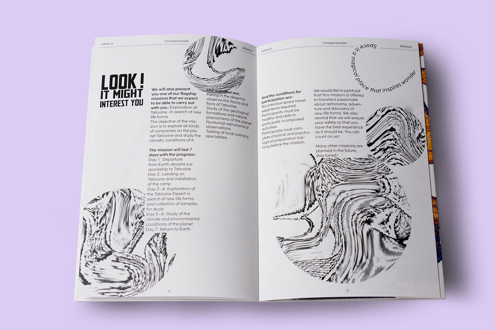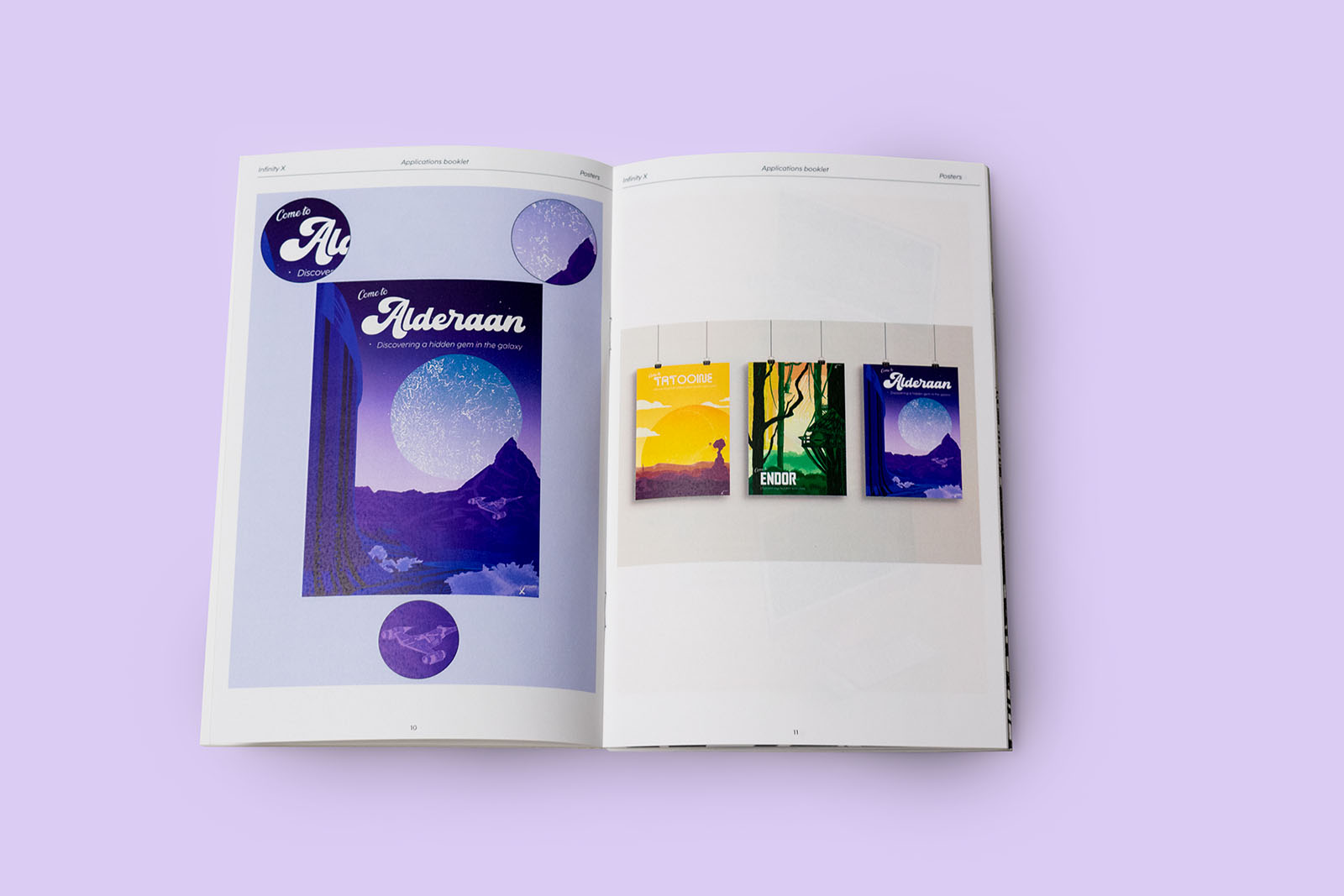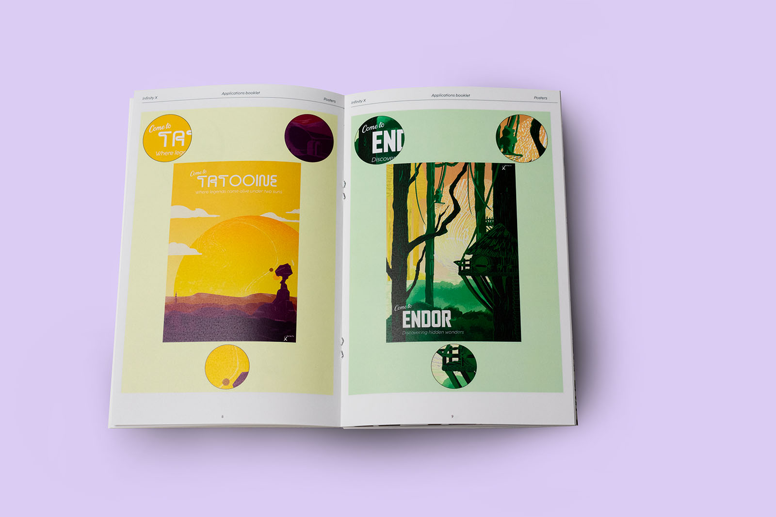 Le concept de cette identité repose sur un travail de textures que j’ai réalisé afin de trouver un style d’images et d’effets cohérents. Ces textures sont omniprésentes et constituent la ligne directrice de mon identité visuelle. Les visuels des affiches s’inspirent des planètes de Star Wars, un monde inconnu en constante expansion, d’où le nom Infinity X. Le choix du format du livret en leporello n’est pas anodin: celui-ci peut également être lu à l’infini, tout comme les petits détails présents dans mes affiches.