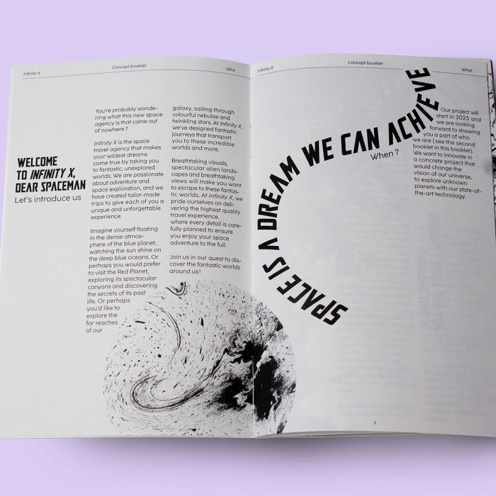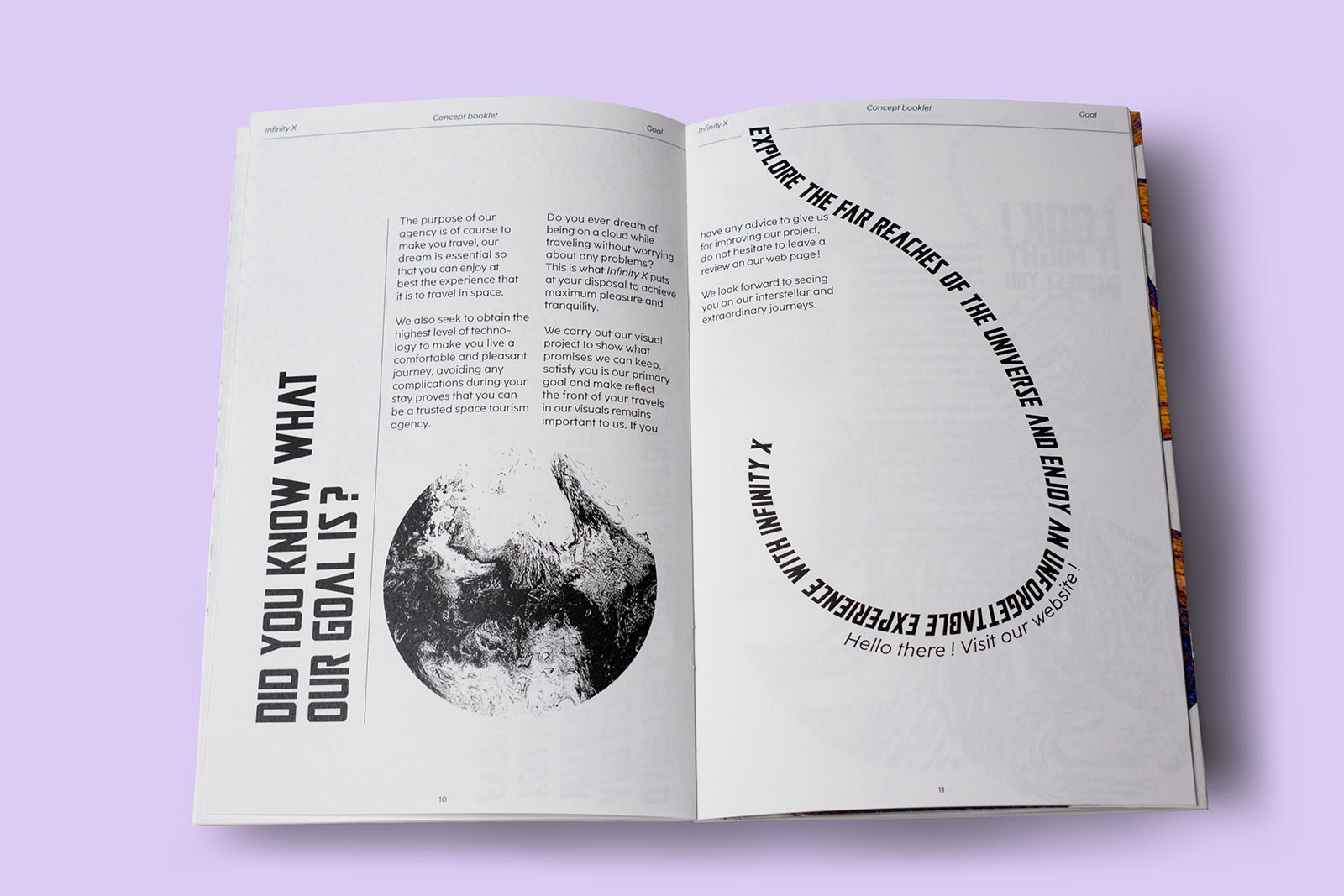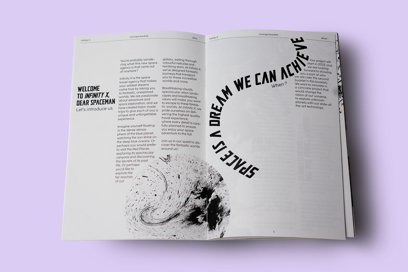 Infinity X est un projet fictif d’une agence spatiale spécialisée dans le tourisme. Après de nombreuses heures passées à dessiner, j’ai créé un univers fantastique et intriguant qui suscite l’envie de voyager dans l’espace.