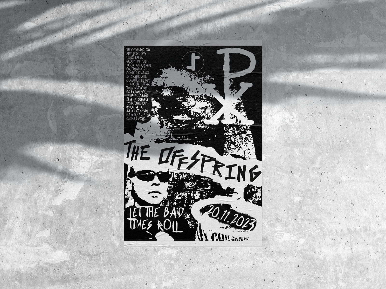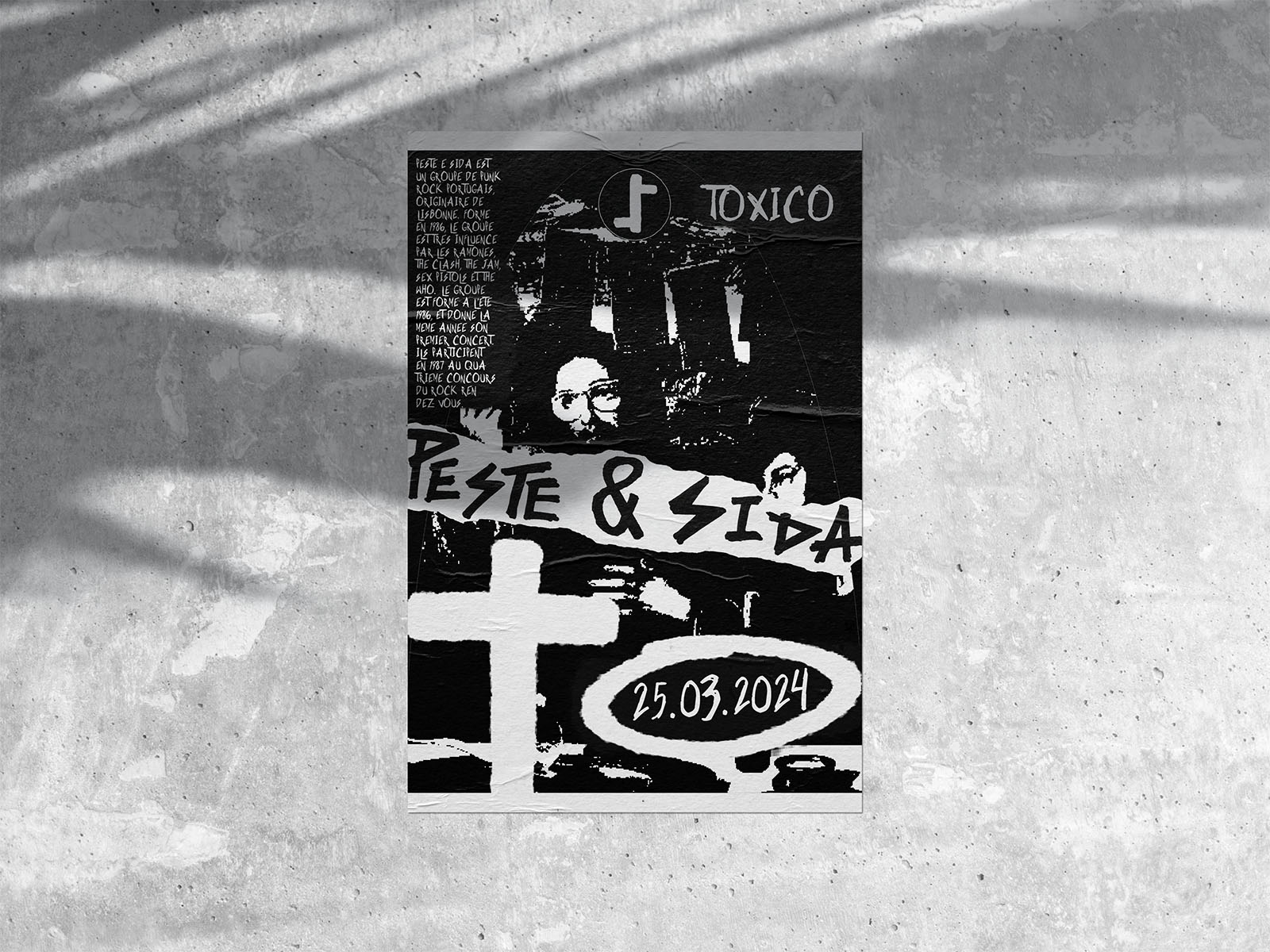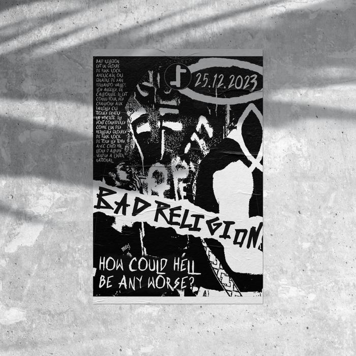 Pour ce projet, j’ai créé l’identité de Fallen Angel, un lieu de culture punk fictif prenant place dans une ancienne église abandonnée. J’ai donc décidé de mixer des éléments esthétiques religieux et des éléments esthétiques punk, en les faisant co-exister sans que cela ne soit dérangeant. Pour le côté religieux, j’ai repris la forme des vitraux, centrée sur les affiches, sur laquelle vient se construire la composition. J’ai également créé des éléments religieux que j’ai intégrés à mes affiches (croix, INRI, etc.). Le côté punk se ressent dans le traitement des images, dans la police d’écriture et dans les autres éléments trash et chaotiques.
