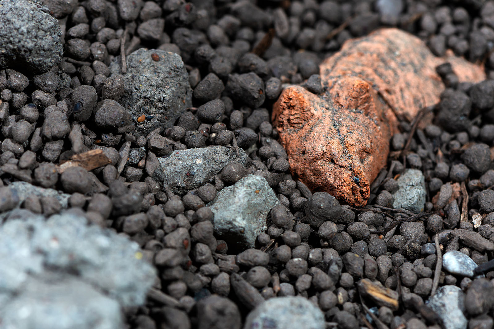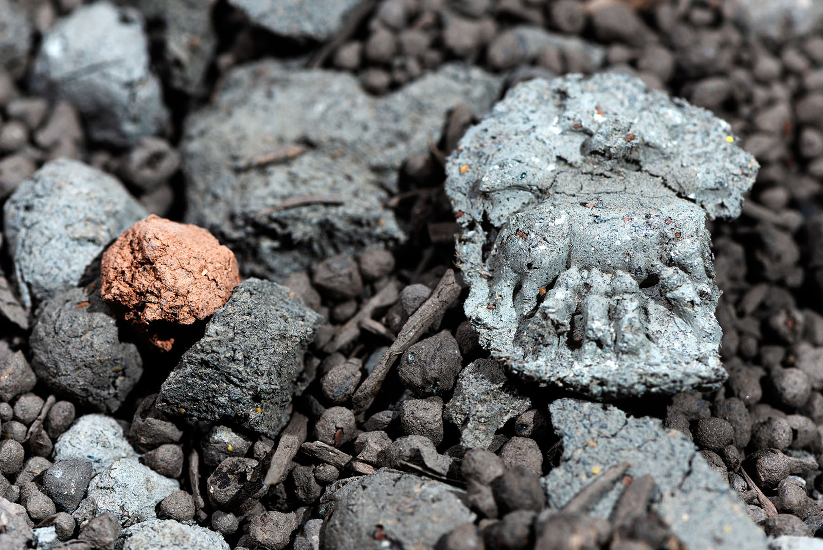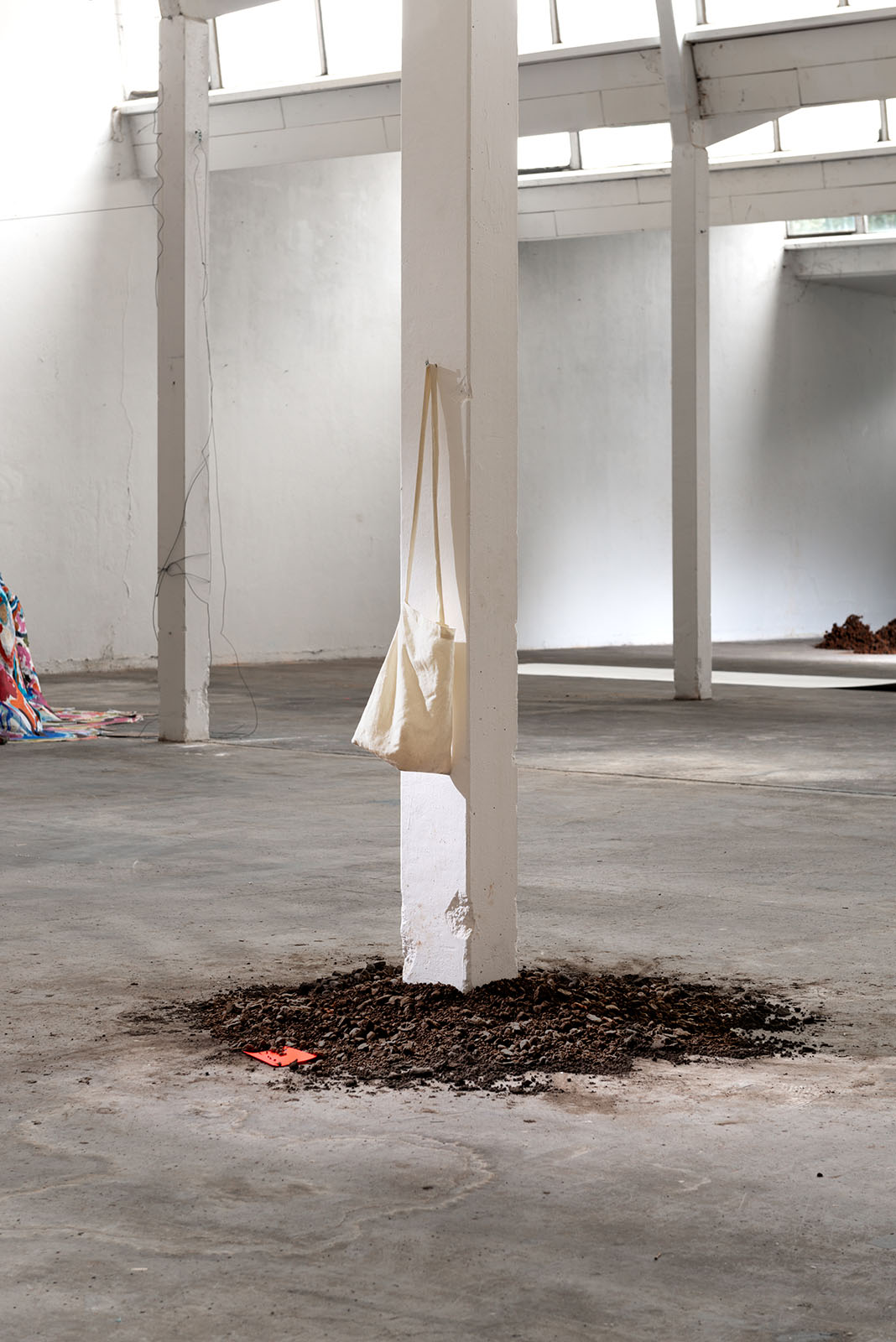 La sculpture est un amas de terre fragmenté et recomposé au pied d’un pilier du lieu d’exposition. Ces mottes de terre renferment des graines qui représentent une biodiversité plus ou moins habituée à pousser sur des sols désolés.