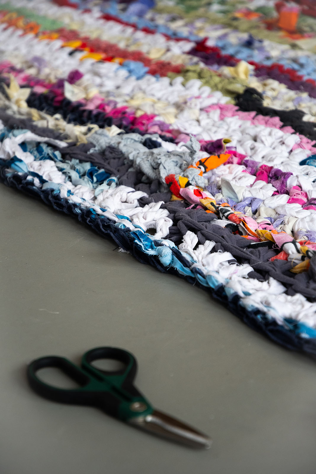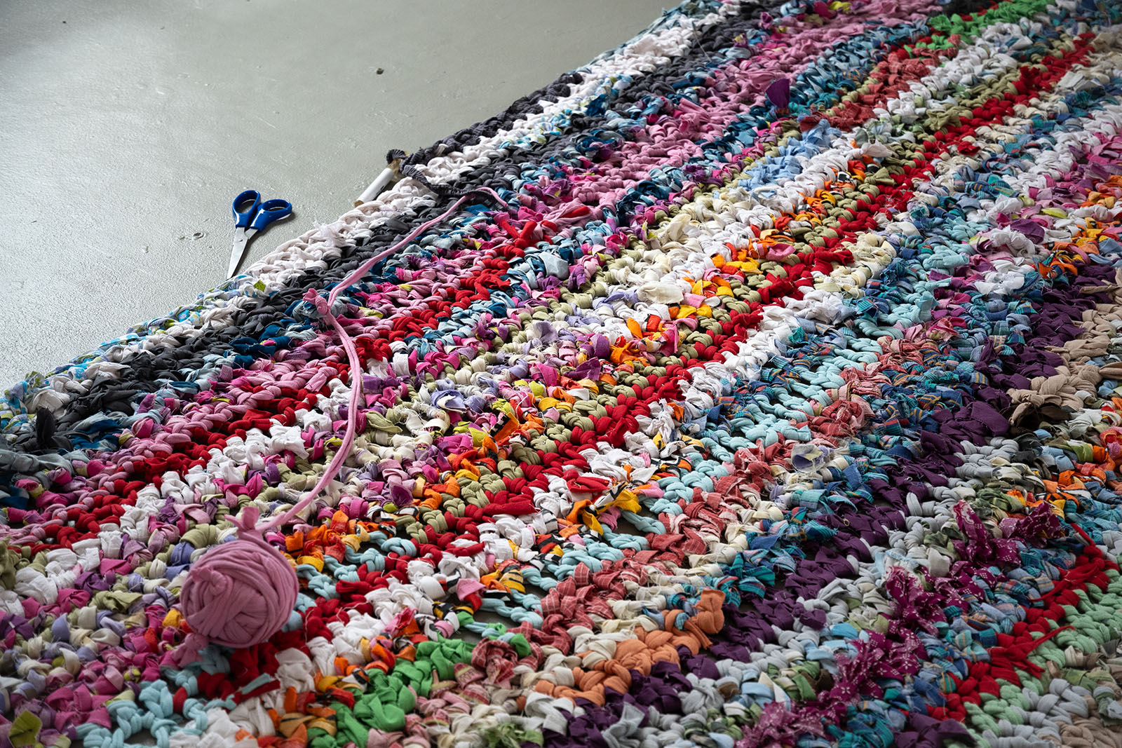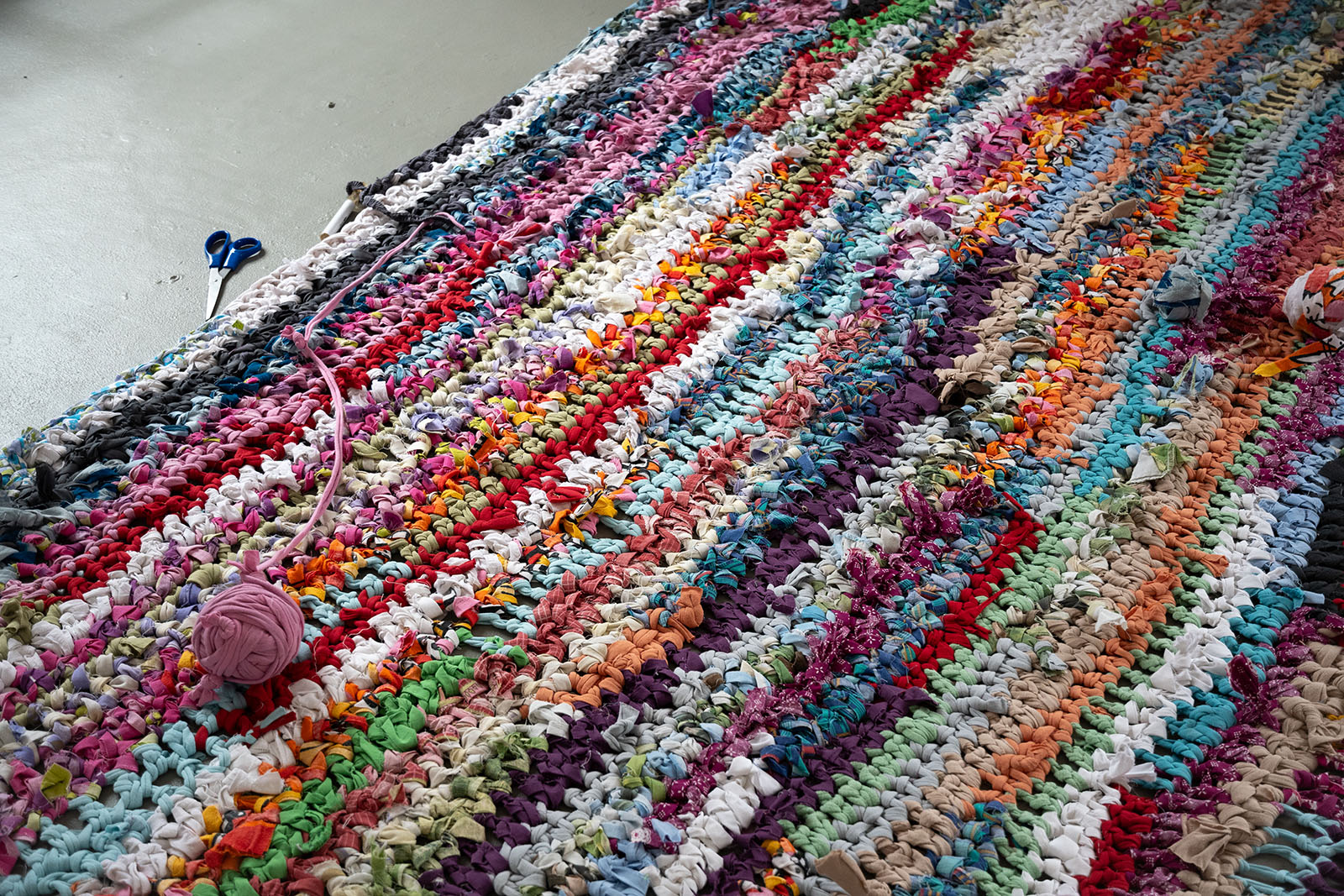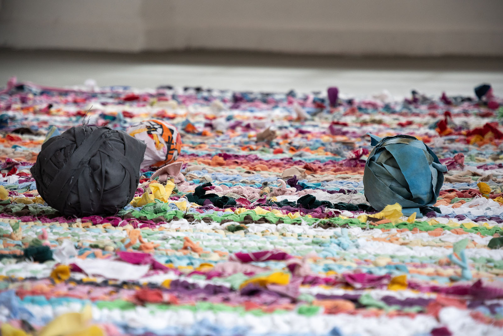 Installation, tapis, dimensions variables, pelotes de tissus recyclés, 2024