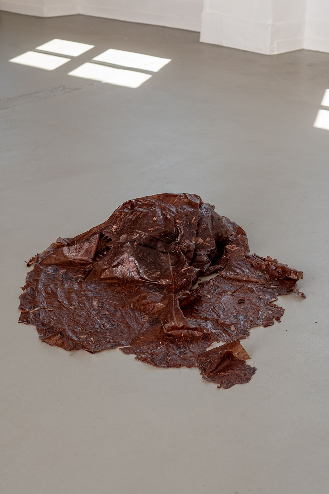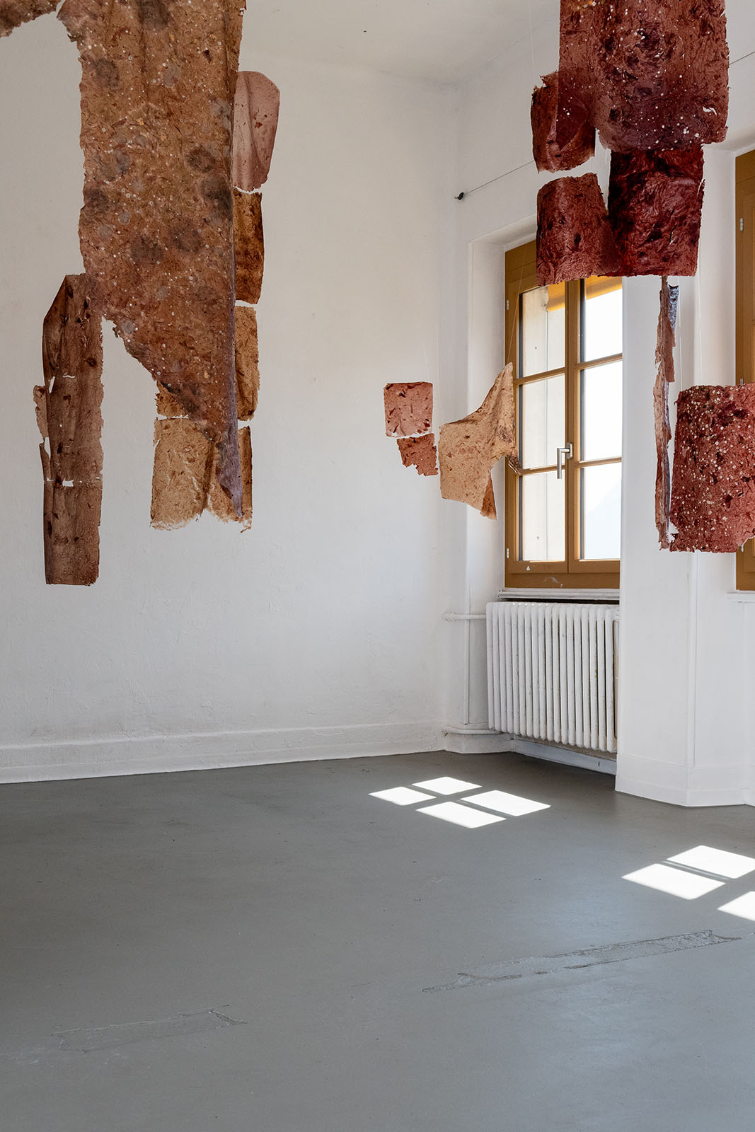 Entre espaces vécus et perçus, ces peaux inter-viennent dans l’espace d’exposition comme une tentative de réinvention des normes architecturales. Leur dimension cartographique propose une pos-sible réécriture de nos espaces de vie et de nos expériences physiques. Lieu de déambulation, la matière porte dans sa structure les failles et les évènements d’un récit en construction.