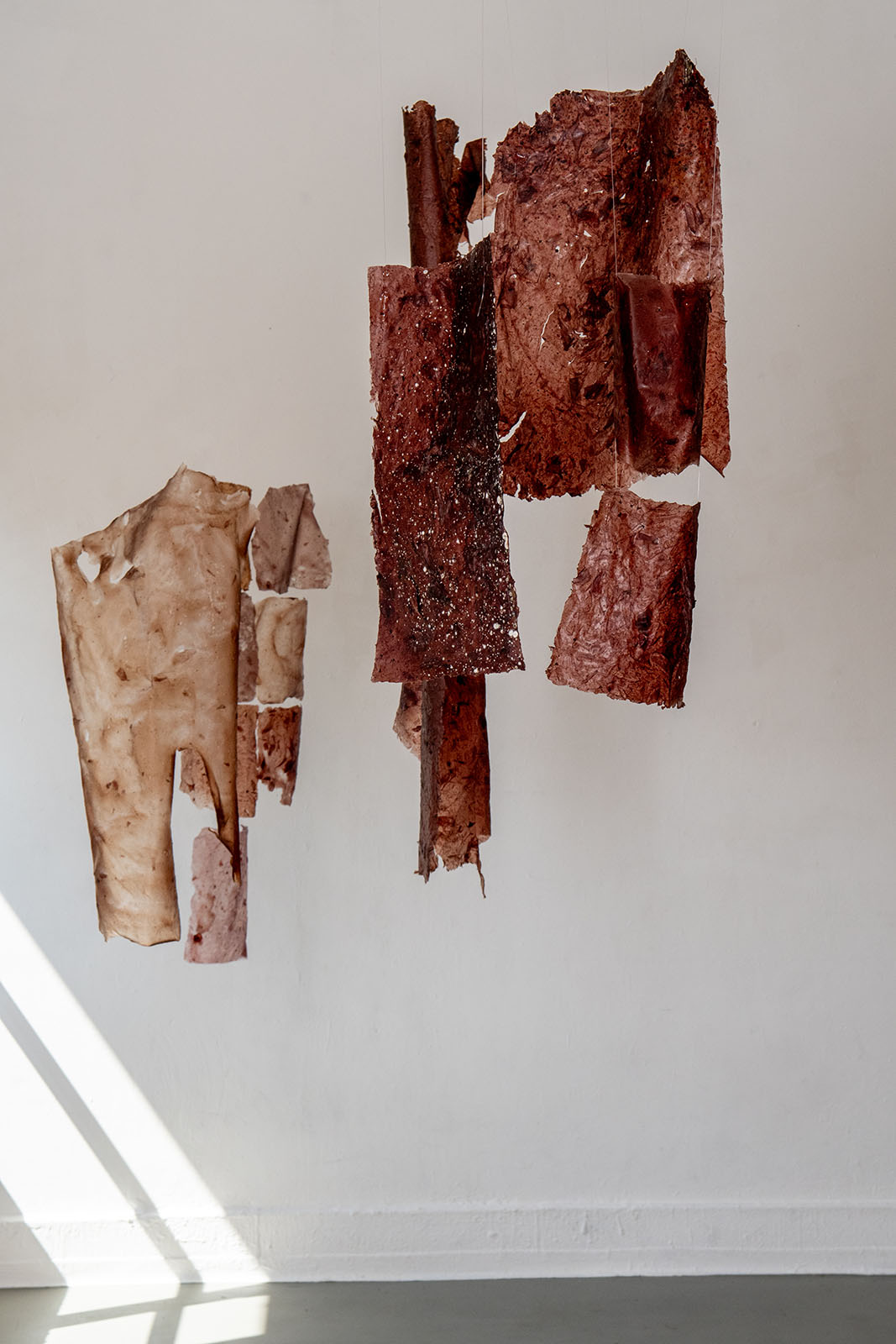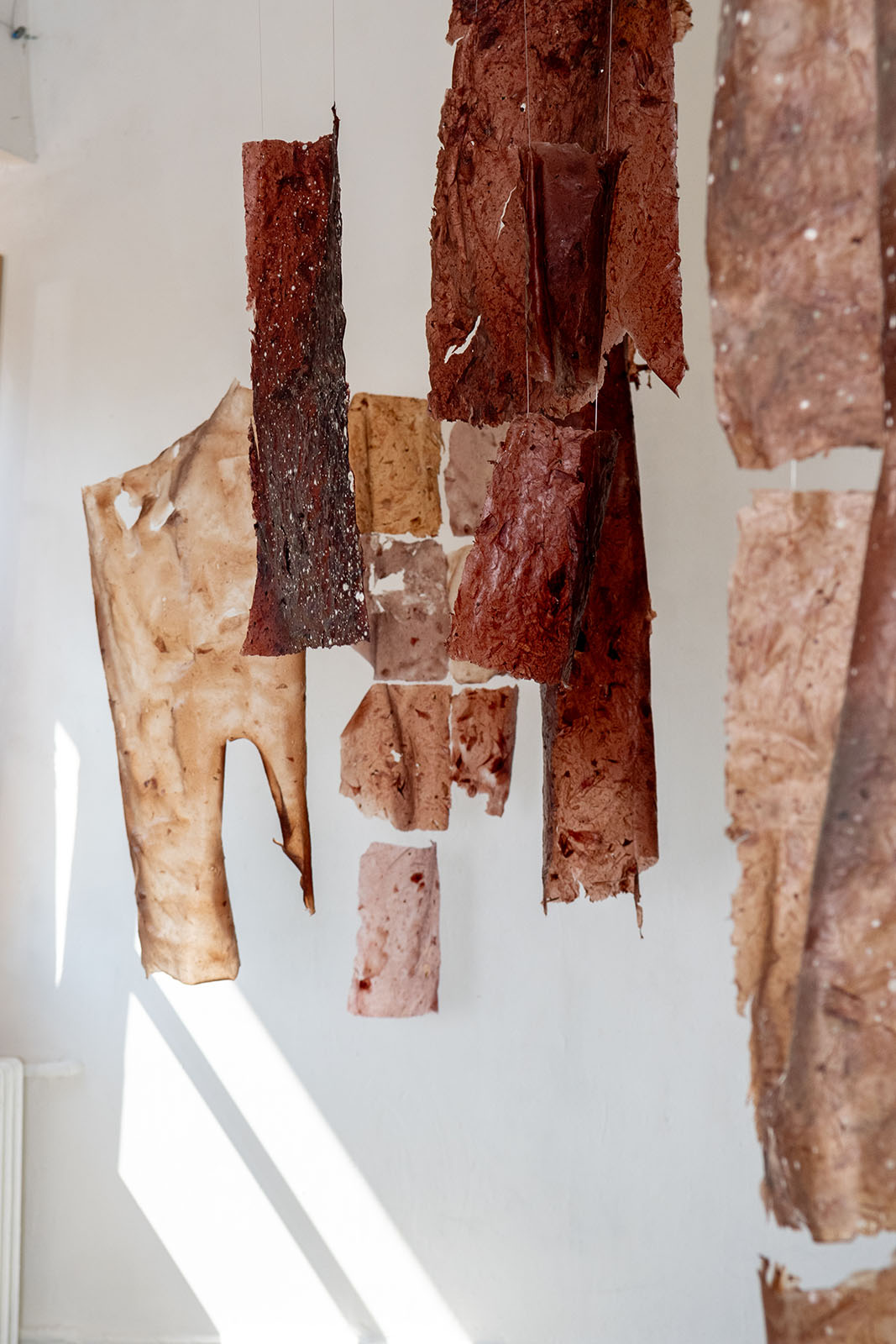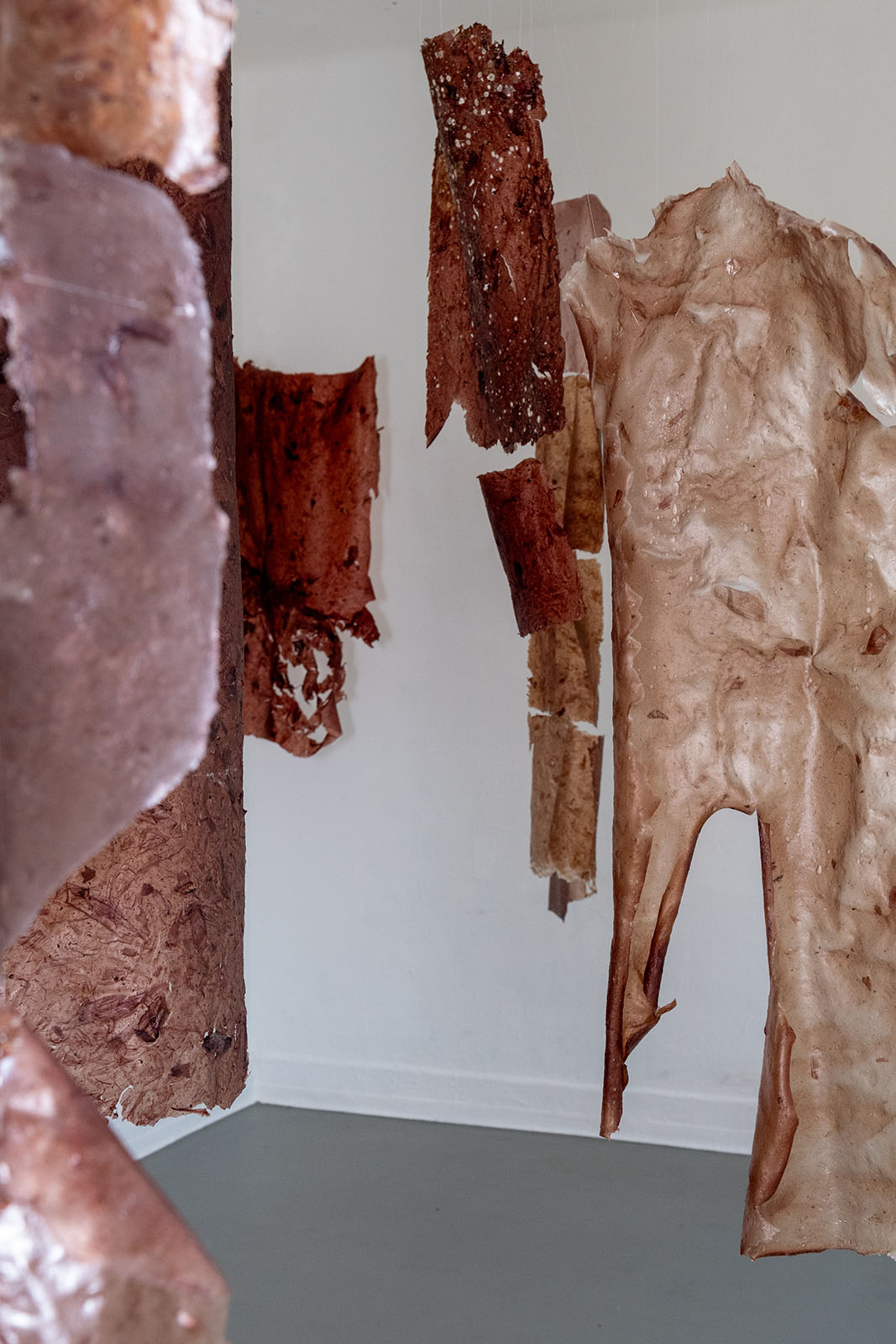 Les Peaux-territoires font écho aux mouvements féministes de réappropriation par le corps. Ce terme lie le soin du corps au soin de la terre, comme formes de souveraineté. Les biomatériaux produits à partir d’oignons rouges deviennent des parois renouve-lables, spatialisées comme des récits flottants.