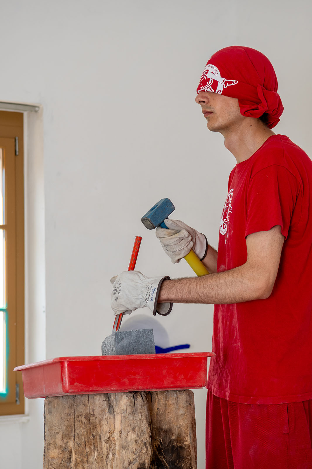 La pierre est taillée à l’aveugle dans cette pièce plusieurs heures durant. Le désordre est ensuite nettoyé à l’aide d’un balai et d’une ramassoire, à nouveau sans faire usage des yeux. L’objet sculpté, quant à lui, est désormais rangé. En attendant, prenez place dans ce lieu afin de manipuler ce qui s’y trouve. Il est en effet permis de se servir de cette sculpture, à condition de tout replacer dans son endroit d’origine.