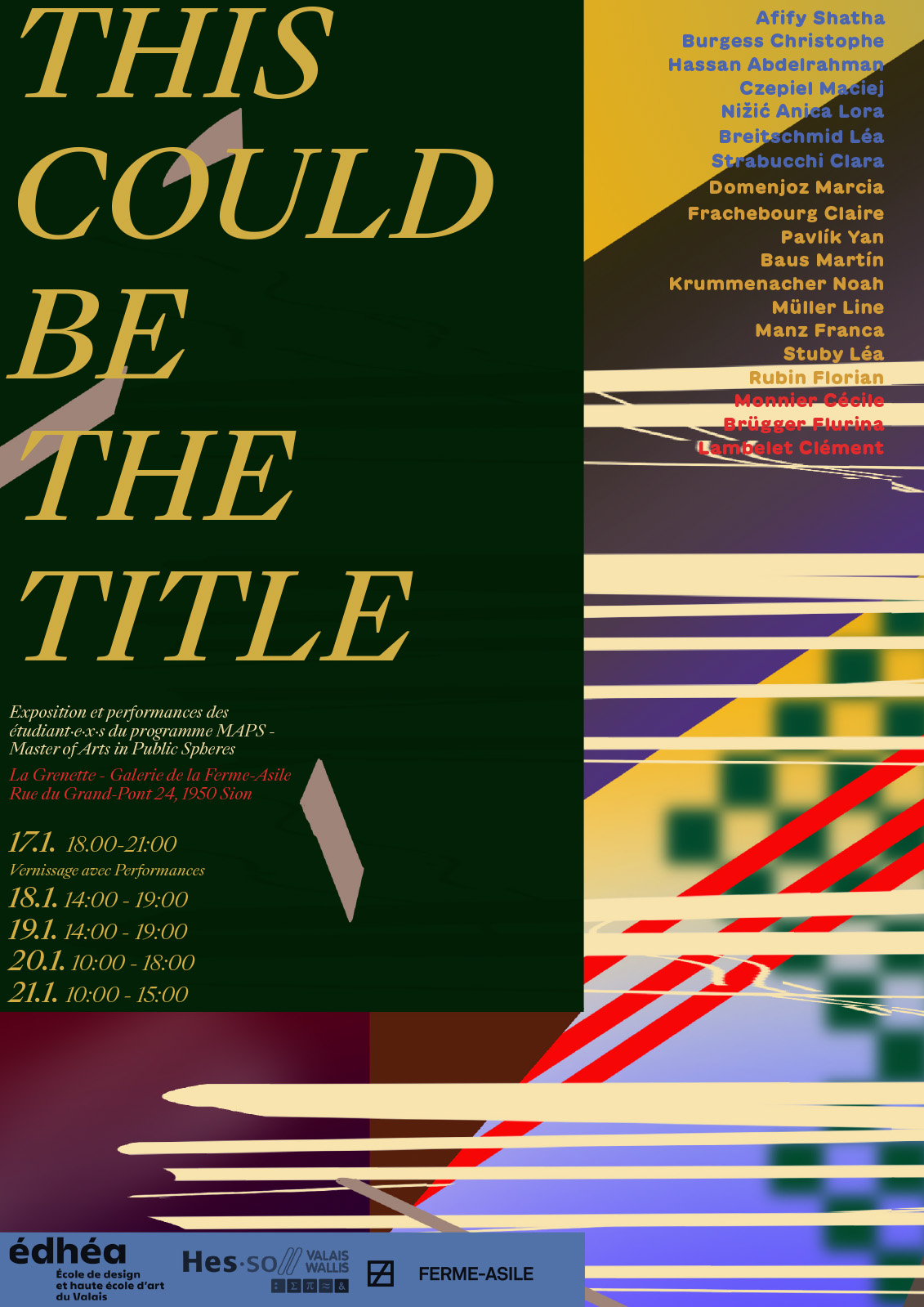 This could be the title est une exposition des étudiant·e·s du MAPS - Master of Arts in Public Spheres. Durant cinq jours, ils et elles présentent leurs travaux à la Grenette, un espace d'exposition de la vieille ville de Sion, géré par le centre artistique et culturel de la Ferme-Asile.