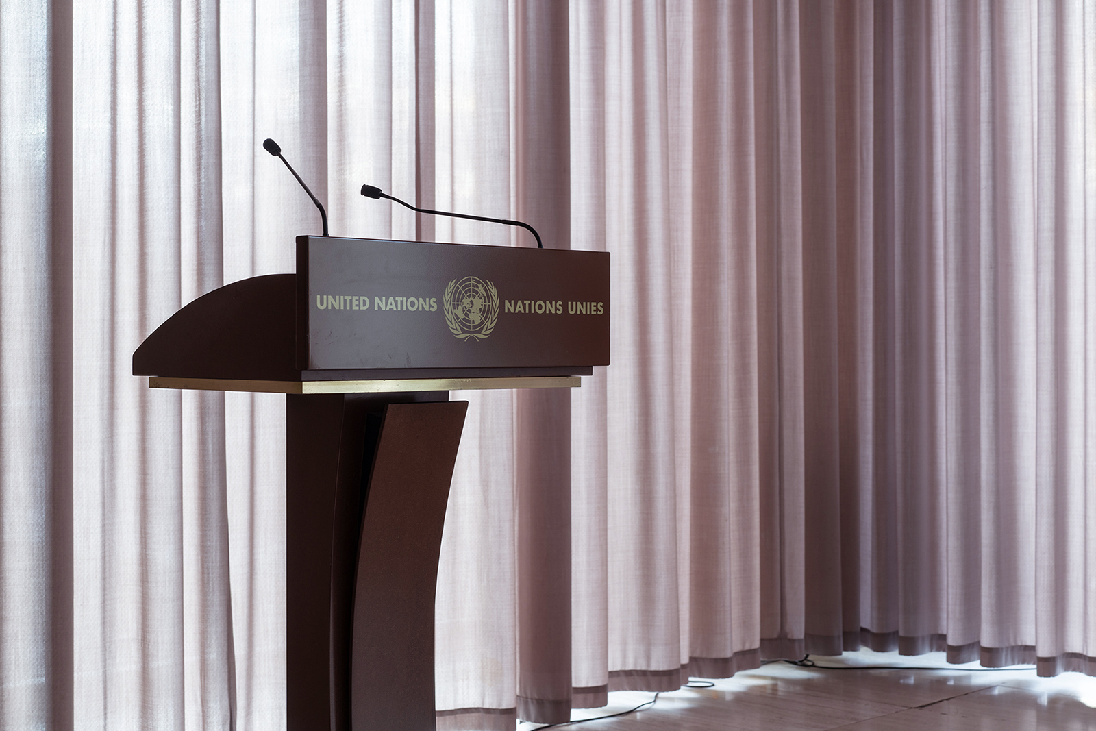 The interior of the Palais des Nations in Geneva, today the European headquarters of the UN, is a stage-like amalgam of gifts from its member states and reflects aesthetic concepts of international politics since the 1930s. Many gifts are still in sight and bear witness to these historical national representations. Others were stored, displaced or just disappeared in the aftermath of historical unrest. Their absence points at inherent power structures and whispers stories of changing political concepts and aesthetics.