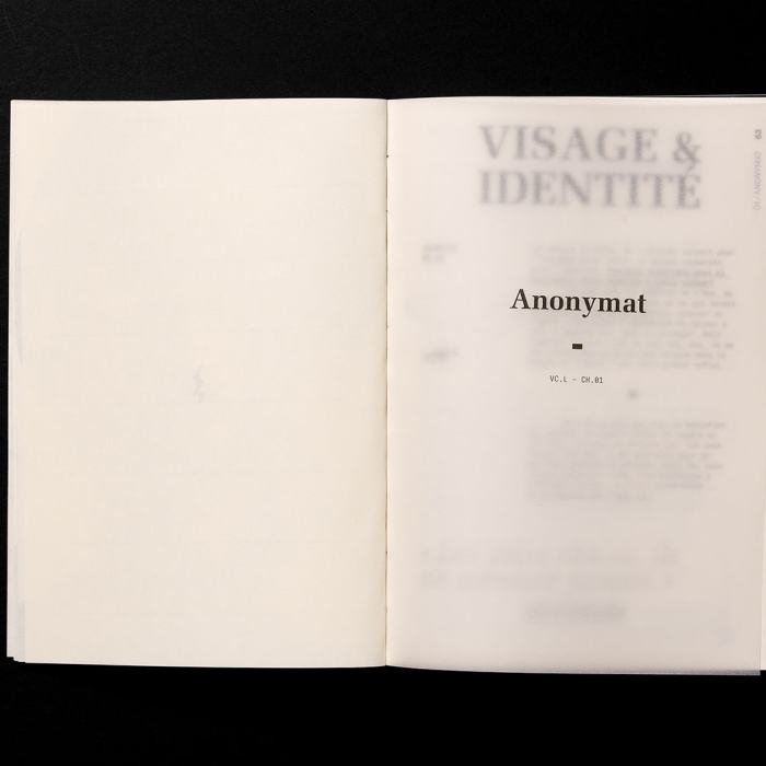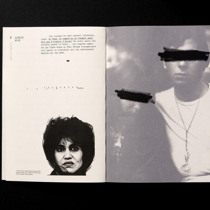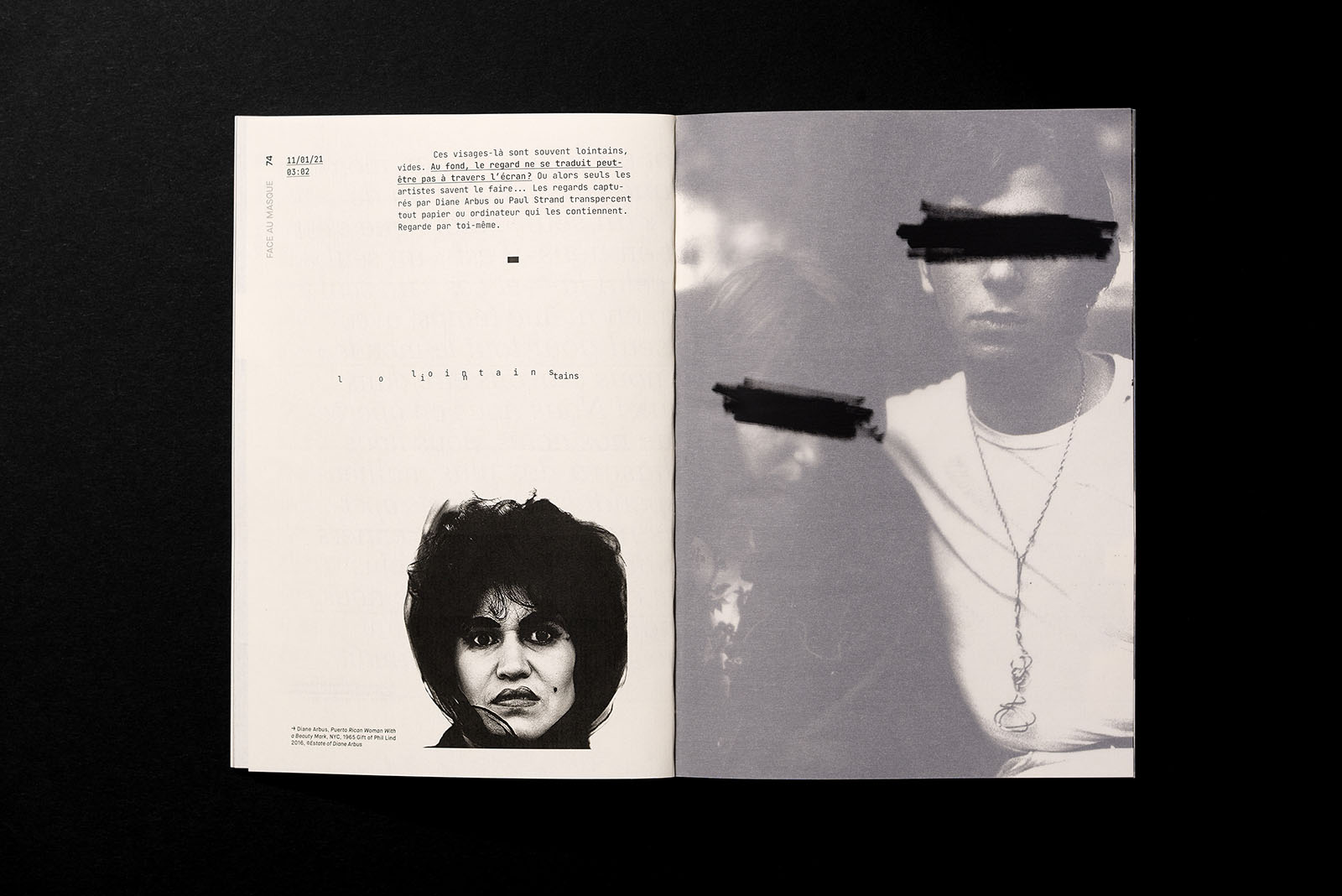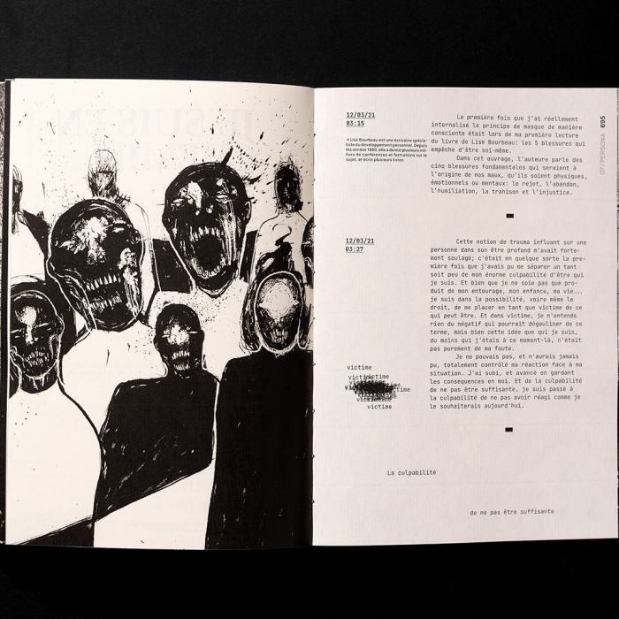 Ce projet de diplôme explore ma volonté de non seulement me détacher, mais surtout de faire face à mon masque: la persona; masque social introduit par Carl Jung. Ce livre-réflexion est une représentation de mon cheminement personnel face à la thématique du masque en tant qu’objet et métaphore. Il a pour but de retracer le chemin tumultueux de la pensée dans sa nature propre: chaotique, emplie de doutes et de questions, et souvent sans réponses. J’ai ainsi mis en page, imprimé, relié et rédigé tout le contenu du livre, enrichi par des études, des musiques, etc. Je l’ai illustré d’expérimentations visuelles analogues de mes photographies personnelles et d’autres artistes pertinents.