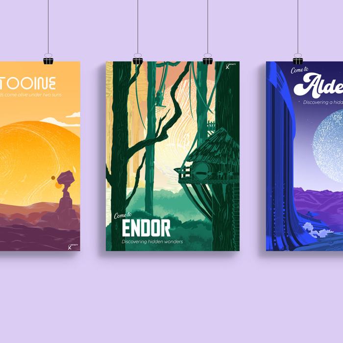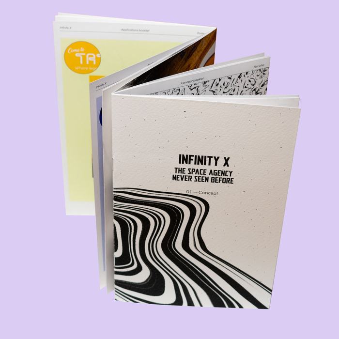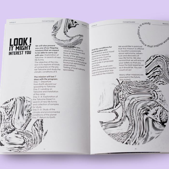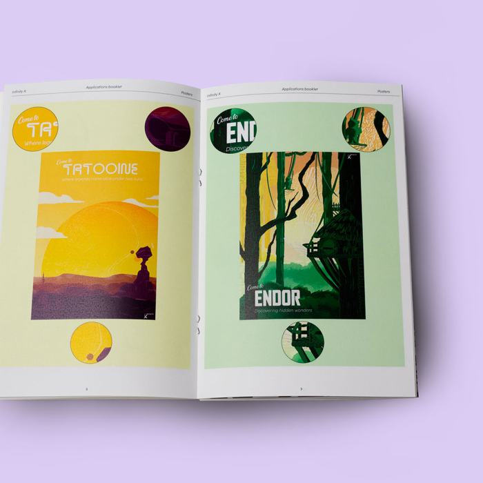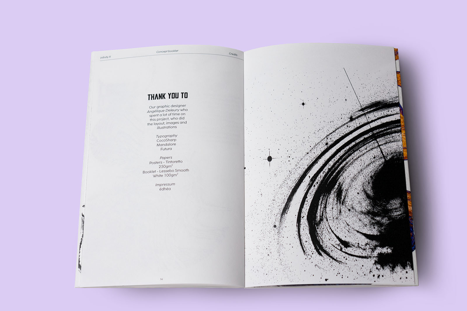 Le concept de cette identité repose sur un travail de textures que j’ai réalisé afin de trouver un style d’images et d’effets cohérents. Ces textures sont omniprésentes et constituent la ligne directrice de mon identité visuelle. Les visuels des affiches s’inspirent des planètes de Star Wars, un monde inconnu en constante expansion, d’où le nom Infinity X. Le choix du format du livret en leporello n’est pas anodin: celui-ci peut également être lu à l’infini, tout comme les petits détails présents dans mes affiches.