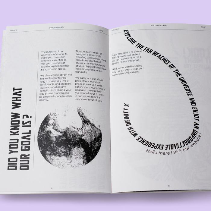 Infinity X est un projet fictif d’une agence spatiale spécialisée dans le tourisme. Après de nombreuses heures passées à dessiner, j’ai créé un univers fantastique et intriguant qui suscite l’envie de voyager dans l’espace.