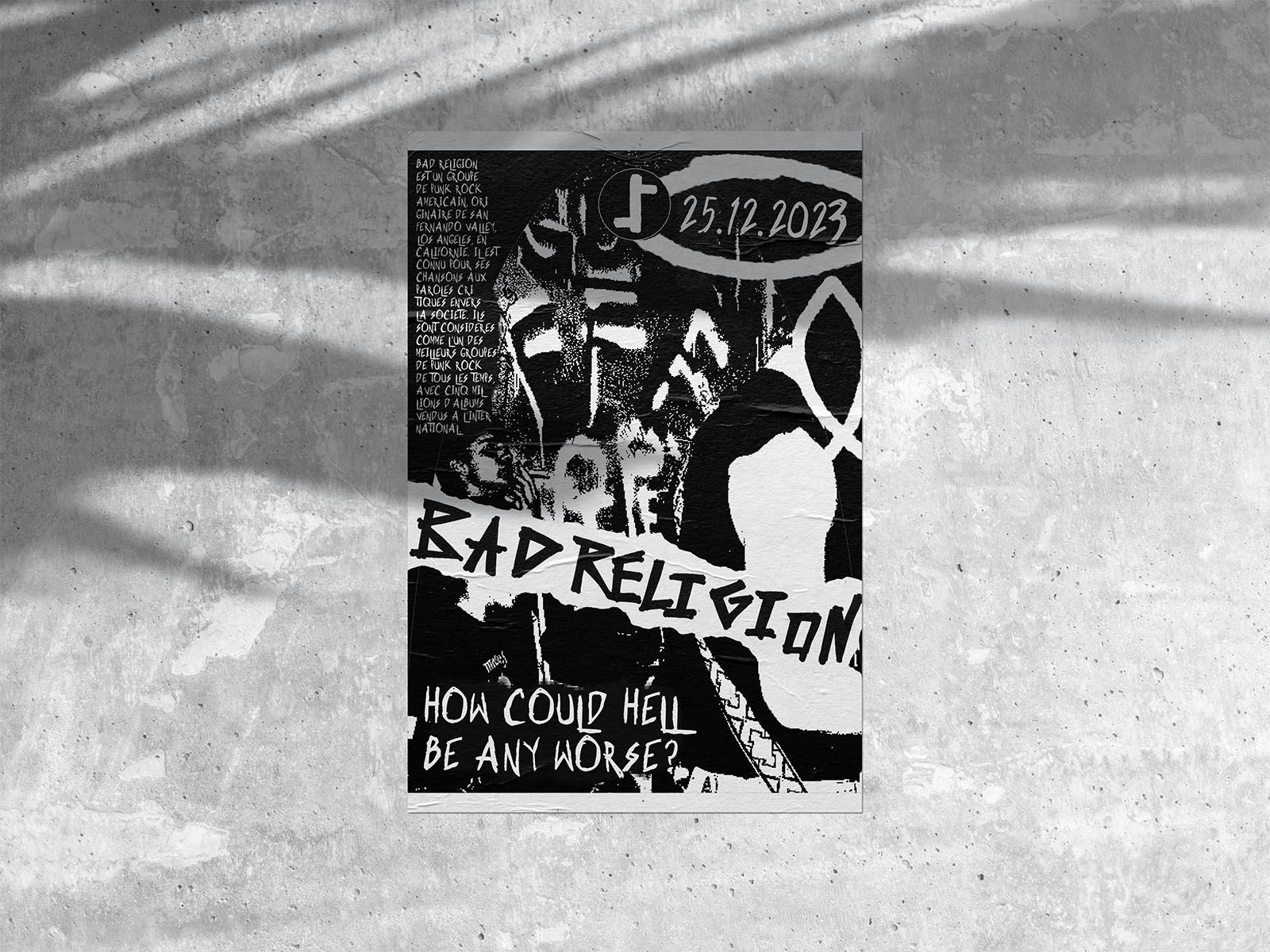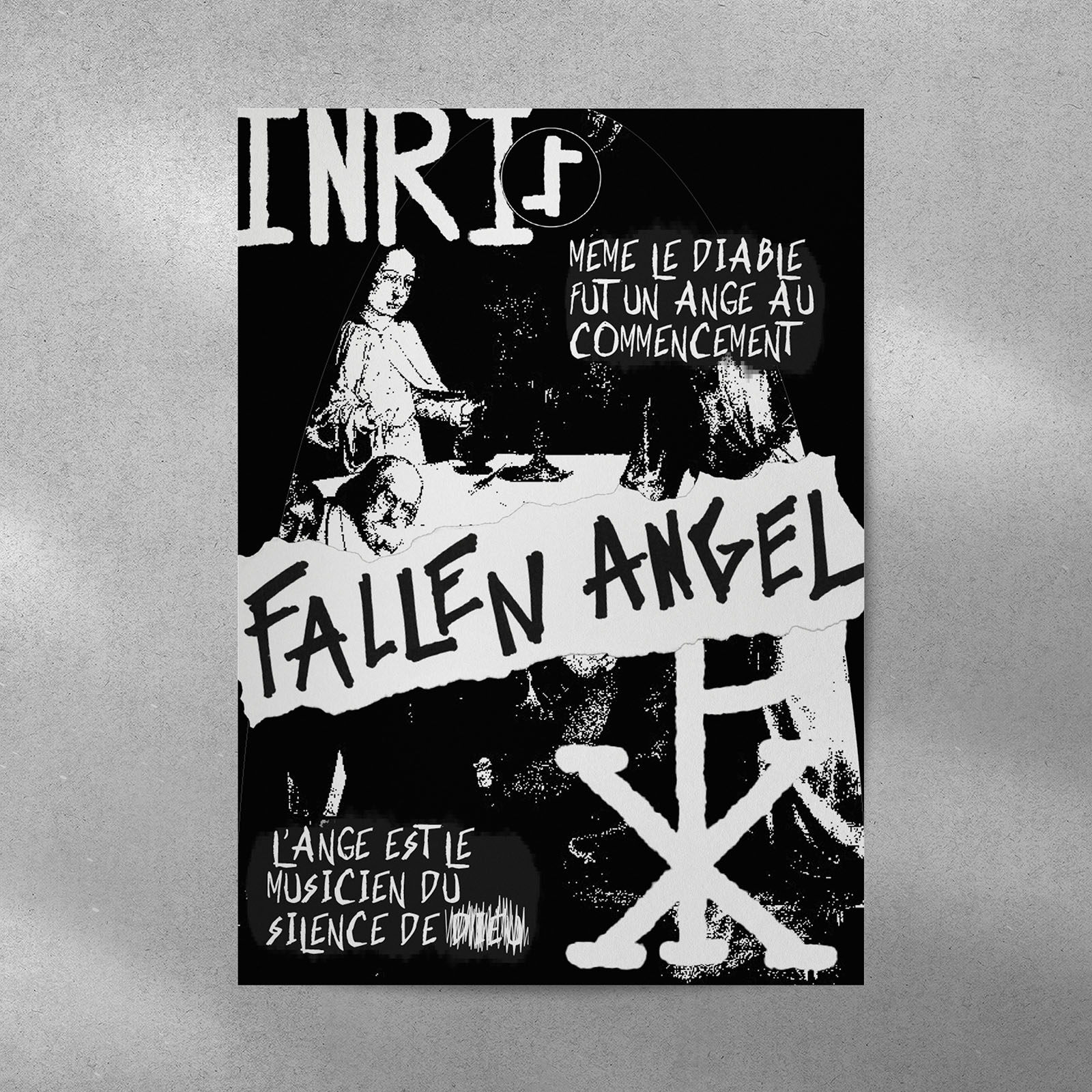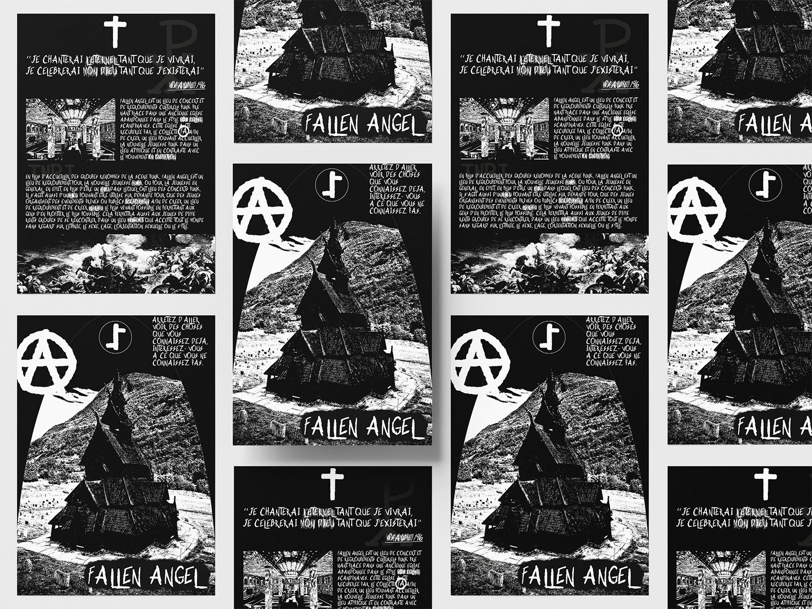 Pour ce projet, j’ai créé l’identité de Fallen Angel, un lieu de culture punk fictif prenant place dans une ancienne église abandonnée. J’ai donc décidé de mixer des éléments esthétiques religieux et des éléments esthétiques punk, en les faisant co-exister sans que cela ne soit dérangeant. Pour le côté religieux, j’ai repris la forme des vitraux, centrée sur les affiches, sur laquelle vient se construire la composition. J’ai également créé des éléments religieux que j’ai intégrés à mes affiches (croix, INRI, etc.). Le côté punk se ressent dans le traitement des images, dans la police d’écriture et dans les autres éléments trash et chaotiques.