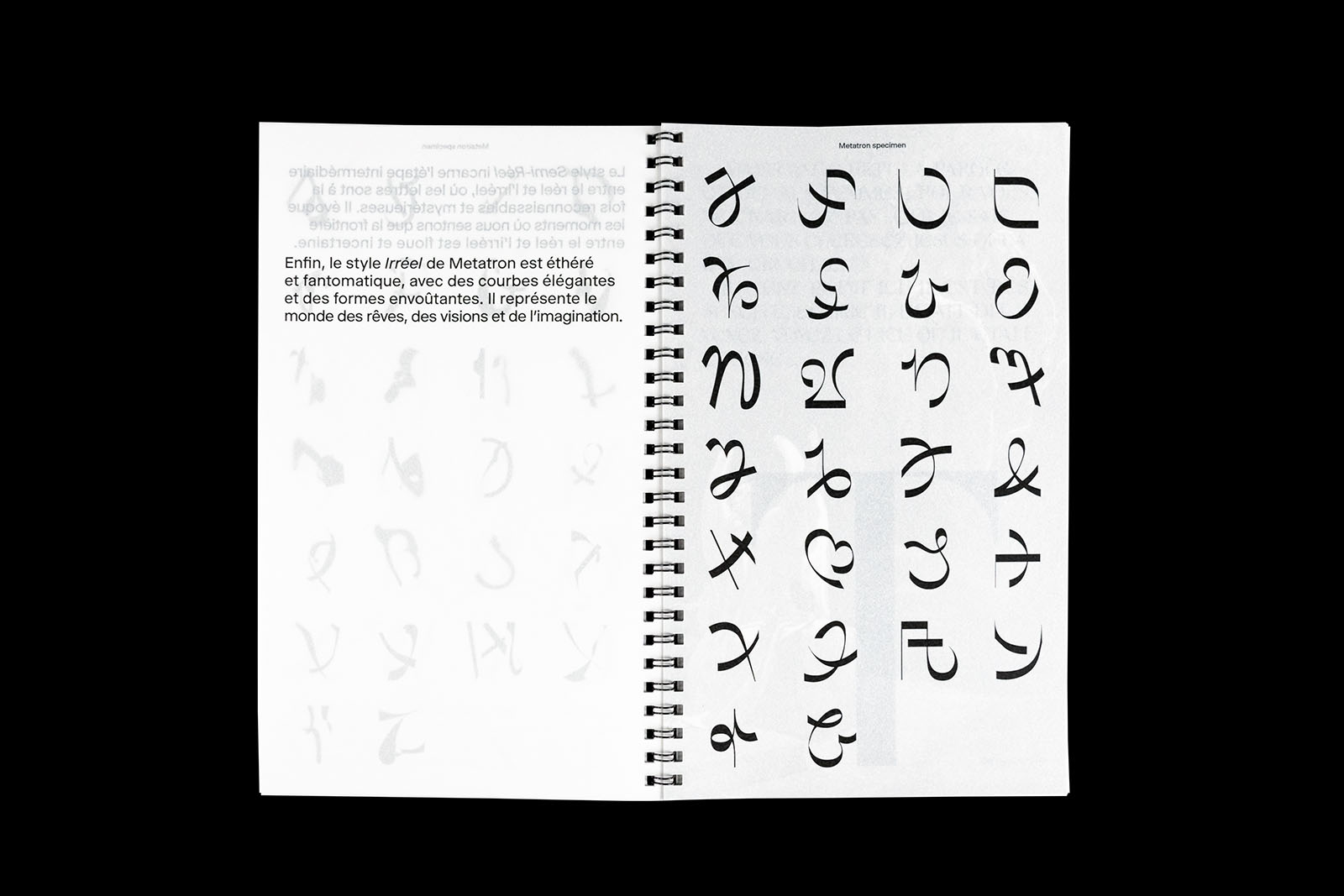 Metatron est une police de caractères variable qui incarne l’essence même du lien entre le réel et l’irréel avec ses trois styles distincts - Réel, Semi-Réel et Irréel. Elle est la clé qui ouvre la porte entre le monde des anges et celui des humains.