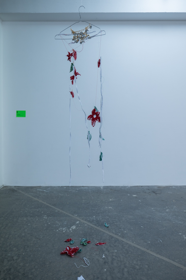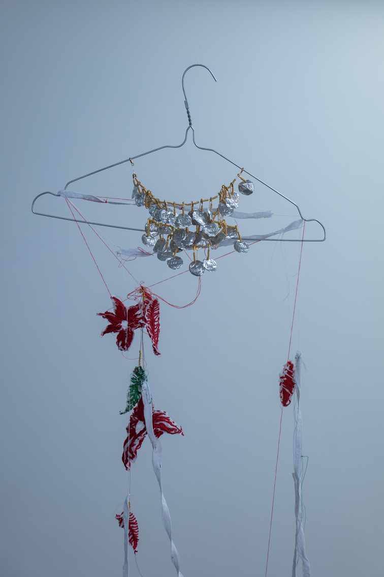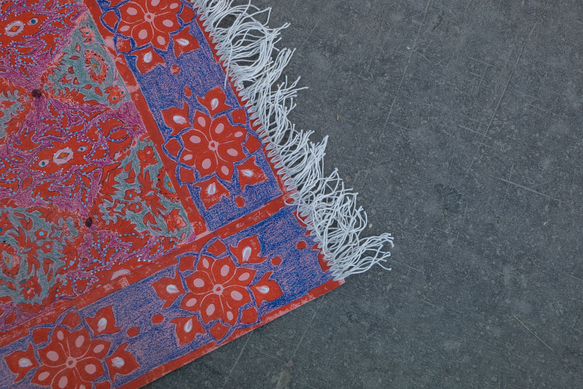 Il s’agit d’une recherche identitaire à travers la fabrication et la transformation. Je recrée un tapis, une tenue et un collier. La réalisation manuelle de ces éléments est lente, mais leur métamorphose est presque instantanée. La robe s'allège de "ce qui n'était plus si précieux". Le tapis se recouvre d’empreintes résultant d’un geste simple mais indélébile, comme un échange ou une discussion.