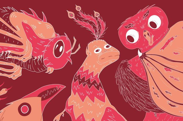 Les élèves ont travaillé en trinômes à l'aide du principe de cadavre-exquis en trois parties. Les réalisations finales représentent des créatures fantaisistes. Trois couleurs ont été imposées, correspondant chacune à un type d’animal: une pour les animaux terrestres, une pour les animaux volants et une pour les animaux aquatiques.