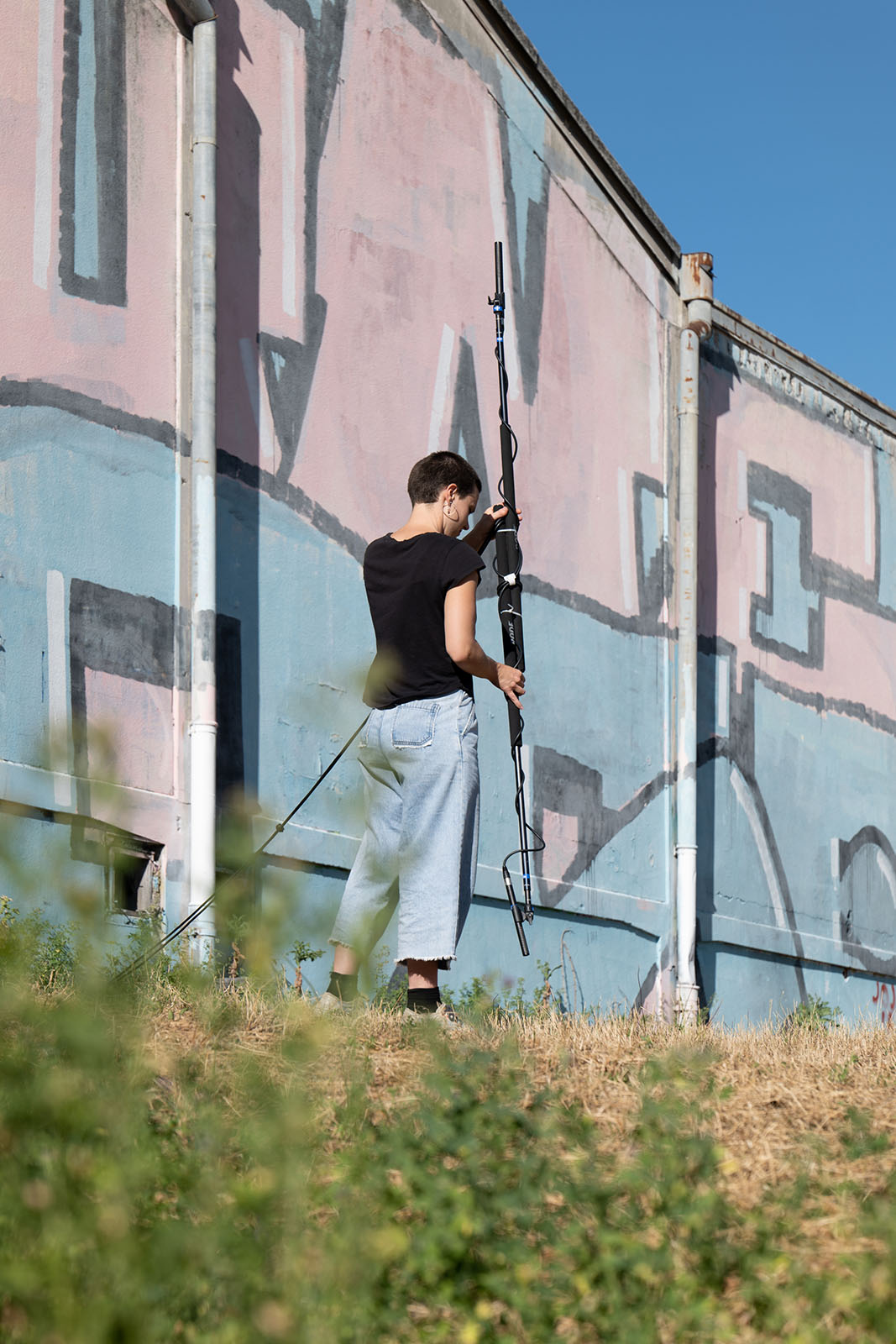 2021, installation performée, tube en PVC, bouche d’égout, membrane de haut-parleur, spray aérosol, corps, micros sur perches, bâtiment Usego, environnement sonore, montagnes, terrain, souterrain