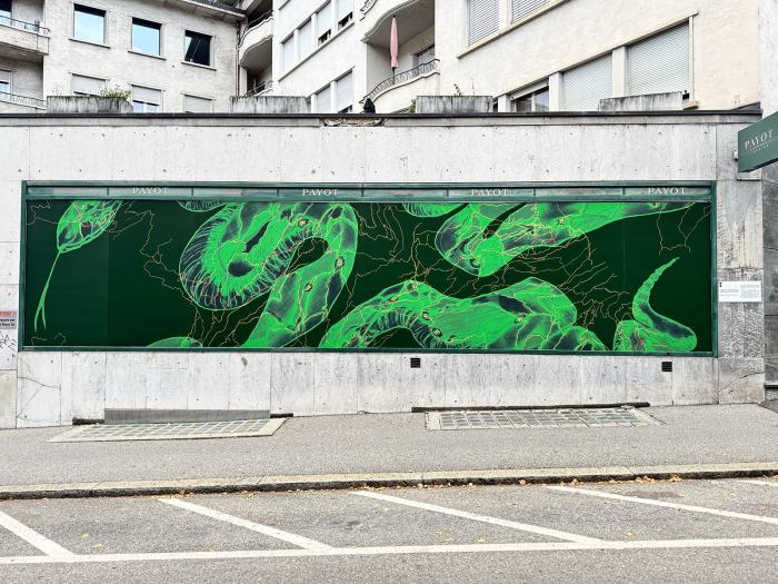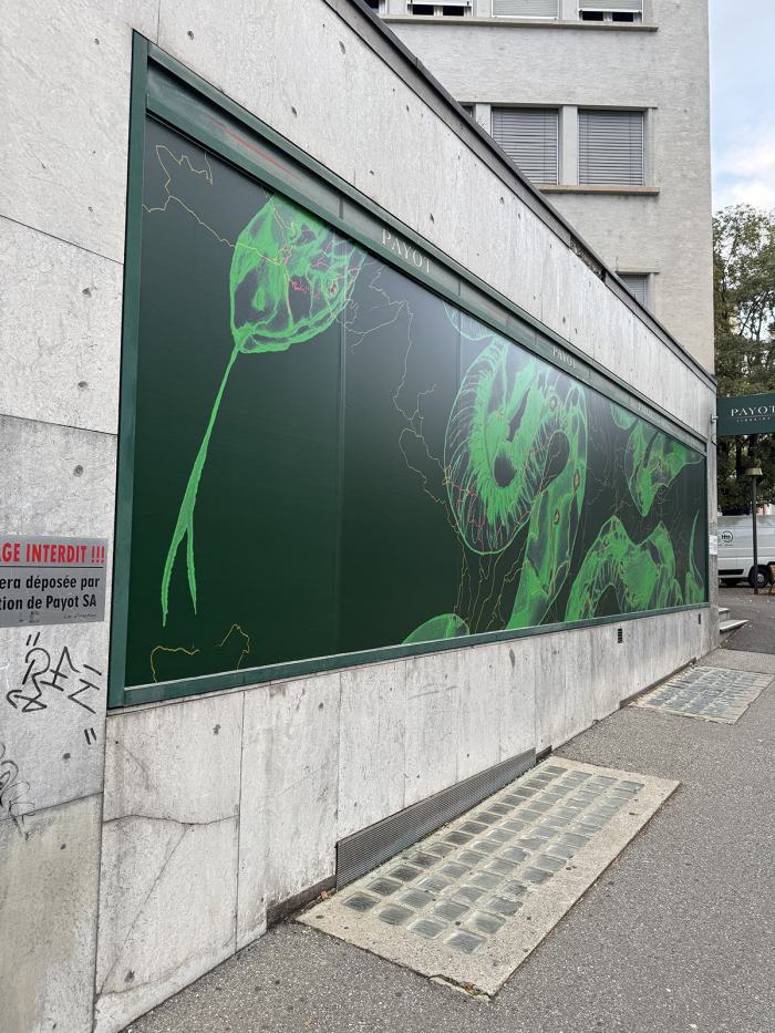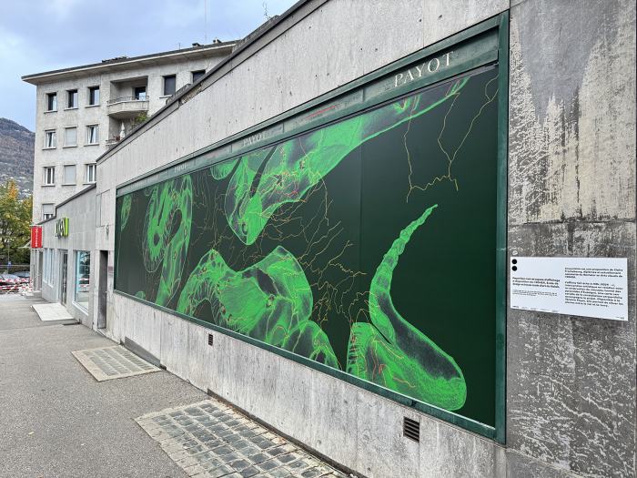 Sur invitation du Service de la Mobilité du Canton du Valais, l’artiste valaisanne Claire Frachebourg a réalisé au mois de septembre 2024 une intervention artistique en relation avec la construction du tunnel des Pyramides d’Euseigne. Pour la façade de Payot Sion, elle livre une déclinaison de ce travail.